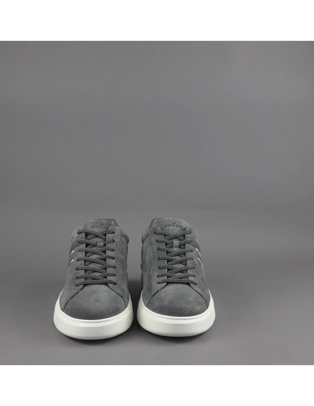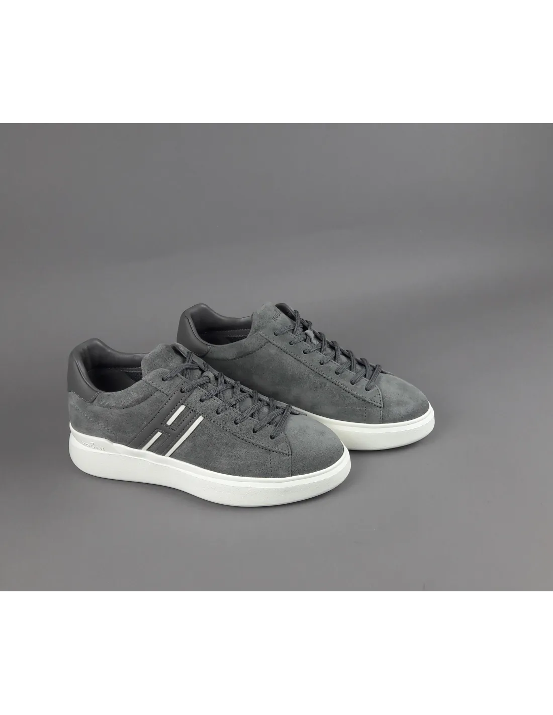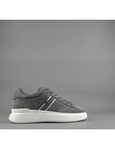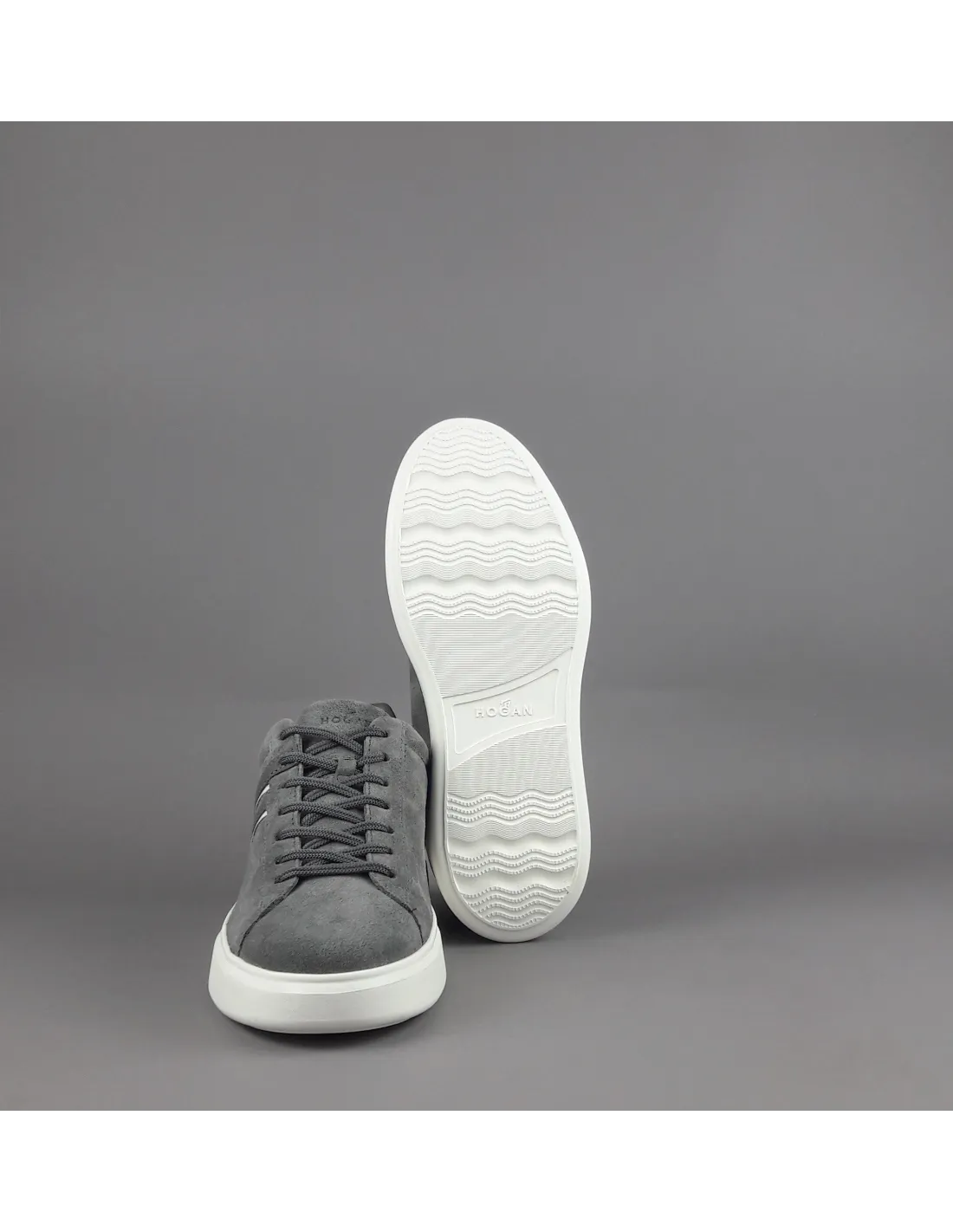 Collezione invernale, sneakers hogan H580 uomo, in camoscio, h cucita in pelle grigia con profilo bianco, spoiler in pelle in tinta, fussbett in memory foam, fondo gomma.