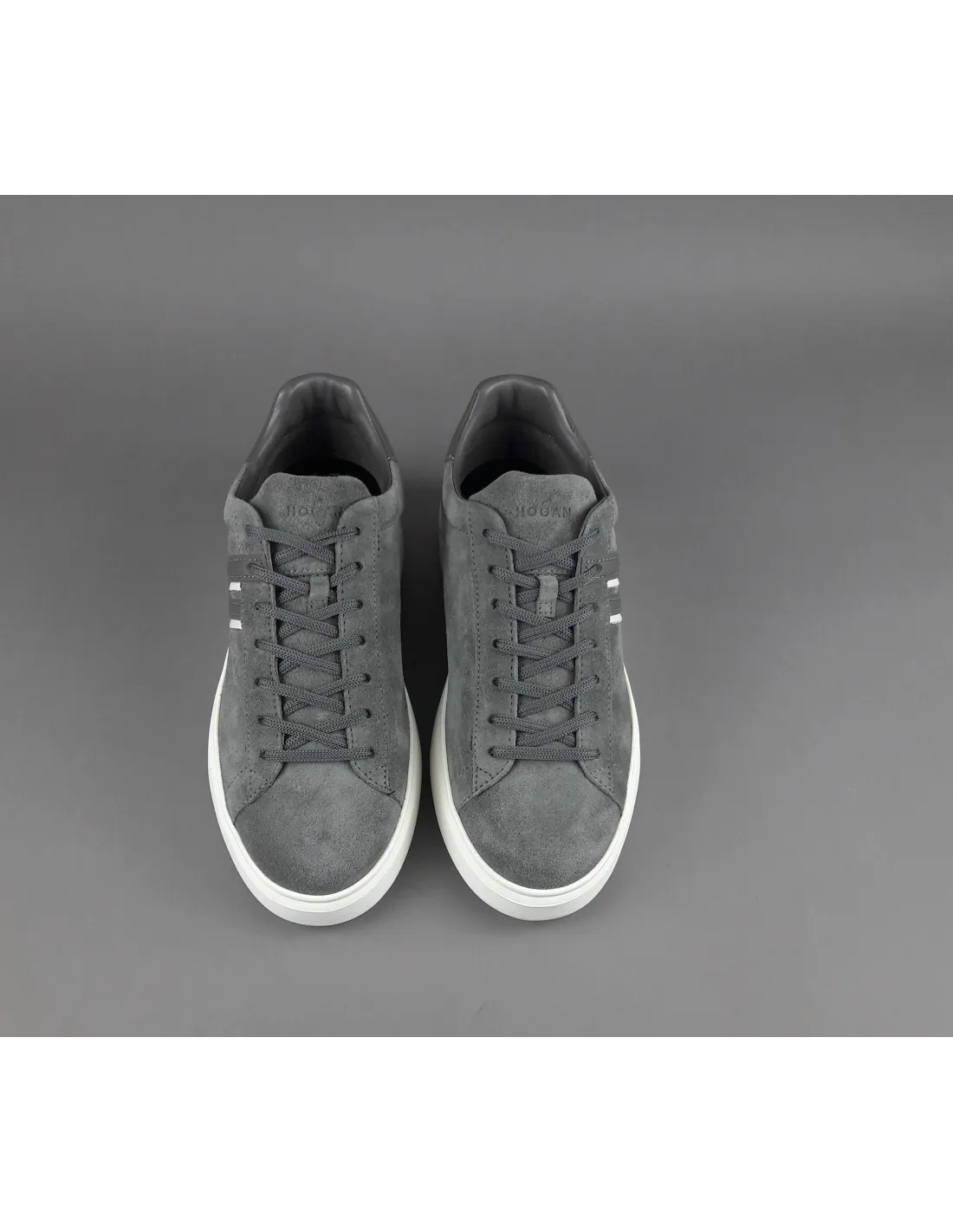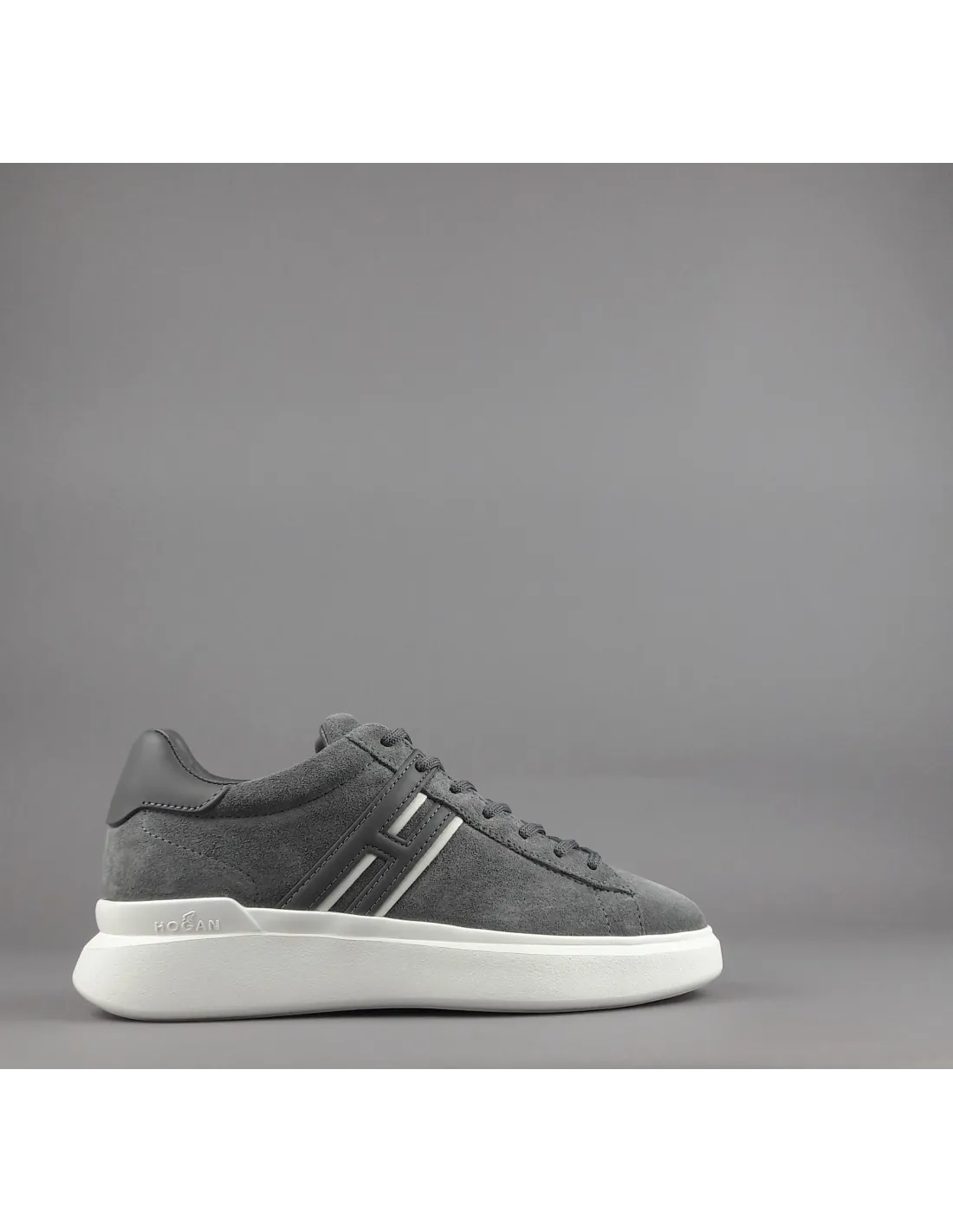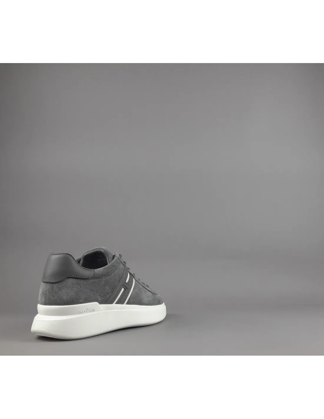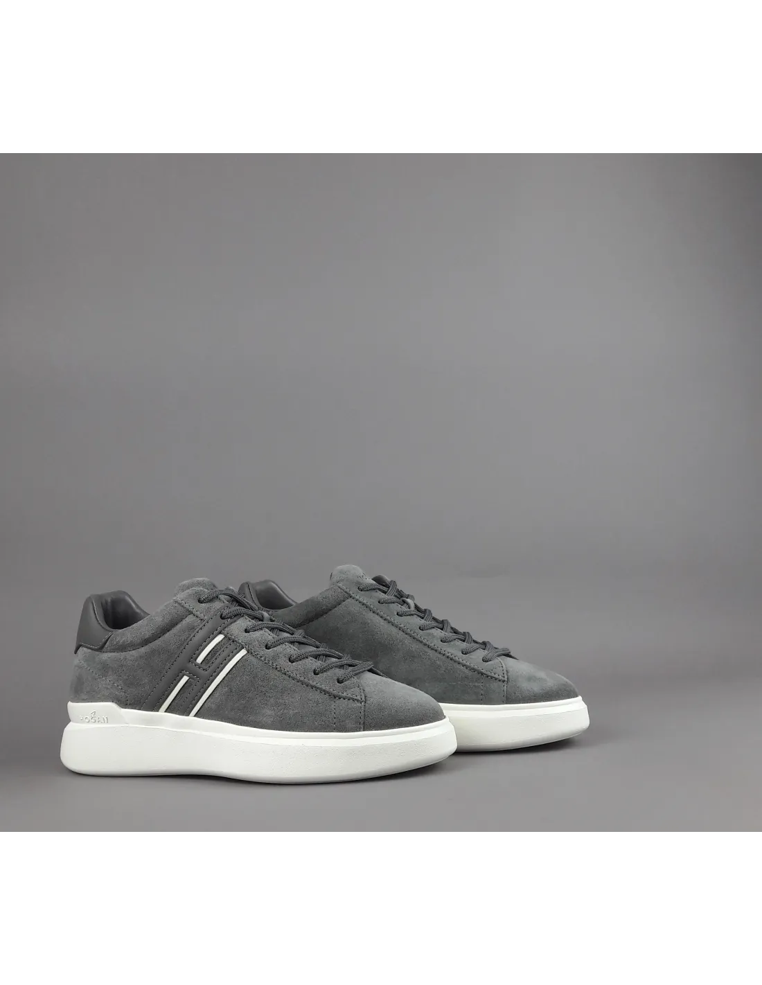 Collezione invernale, sneakers hogan H580 uomo, in camoscio, h cucita in pelle grigia con profilo bianco, spoiler in pelle in tinta, fussbett in memory foam, fondo gomma.