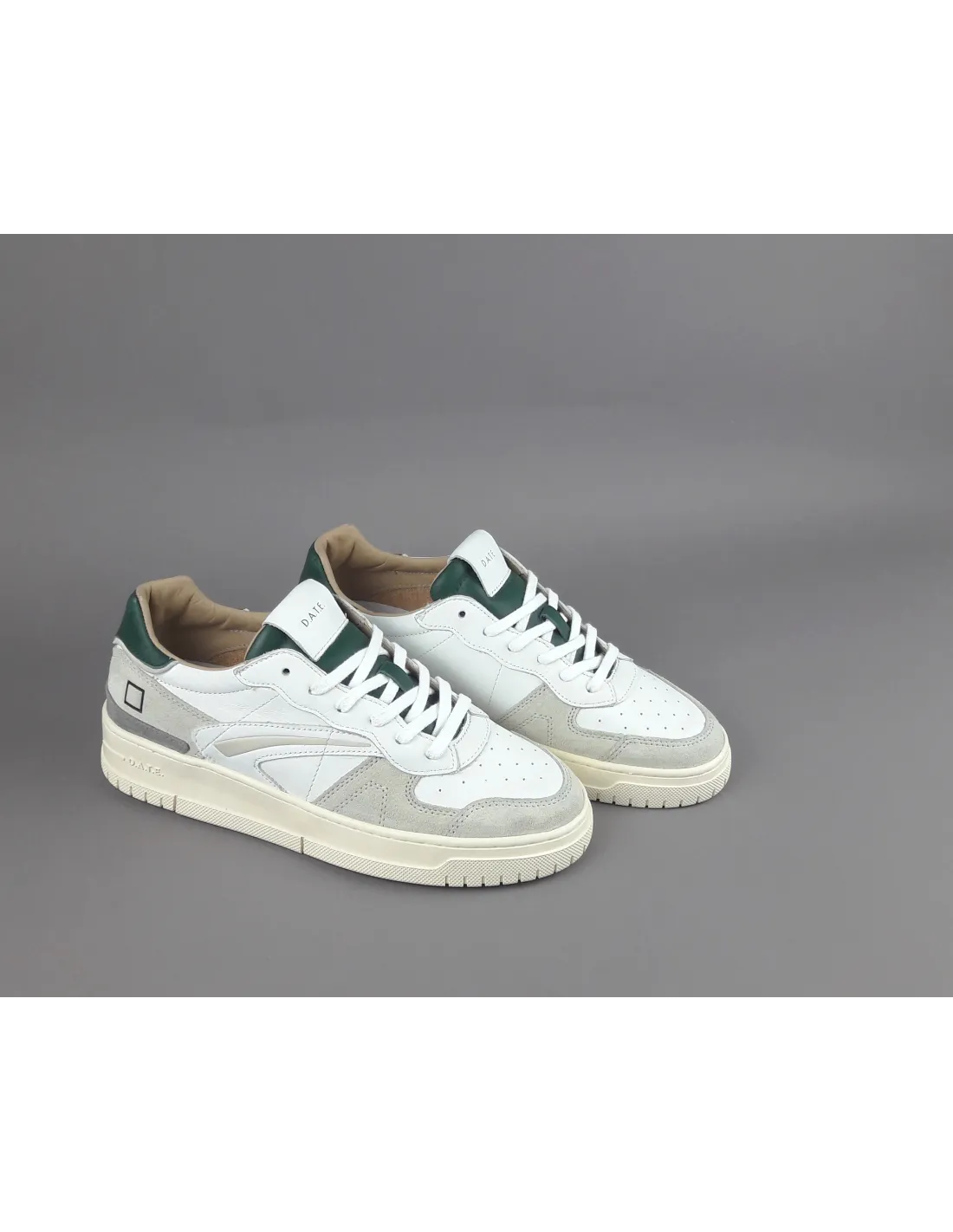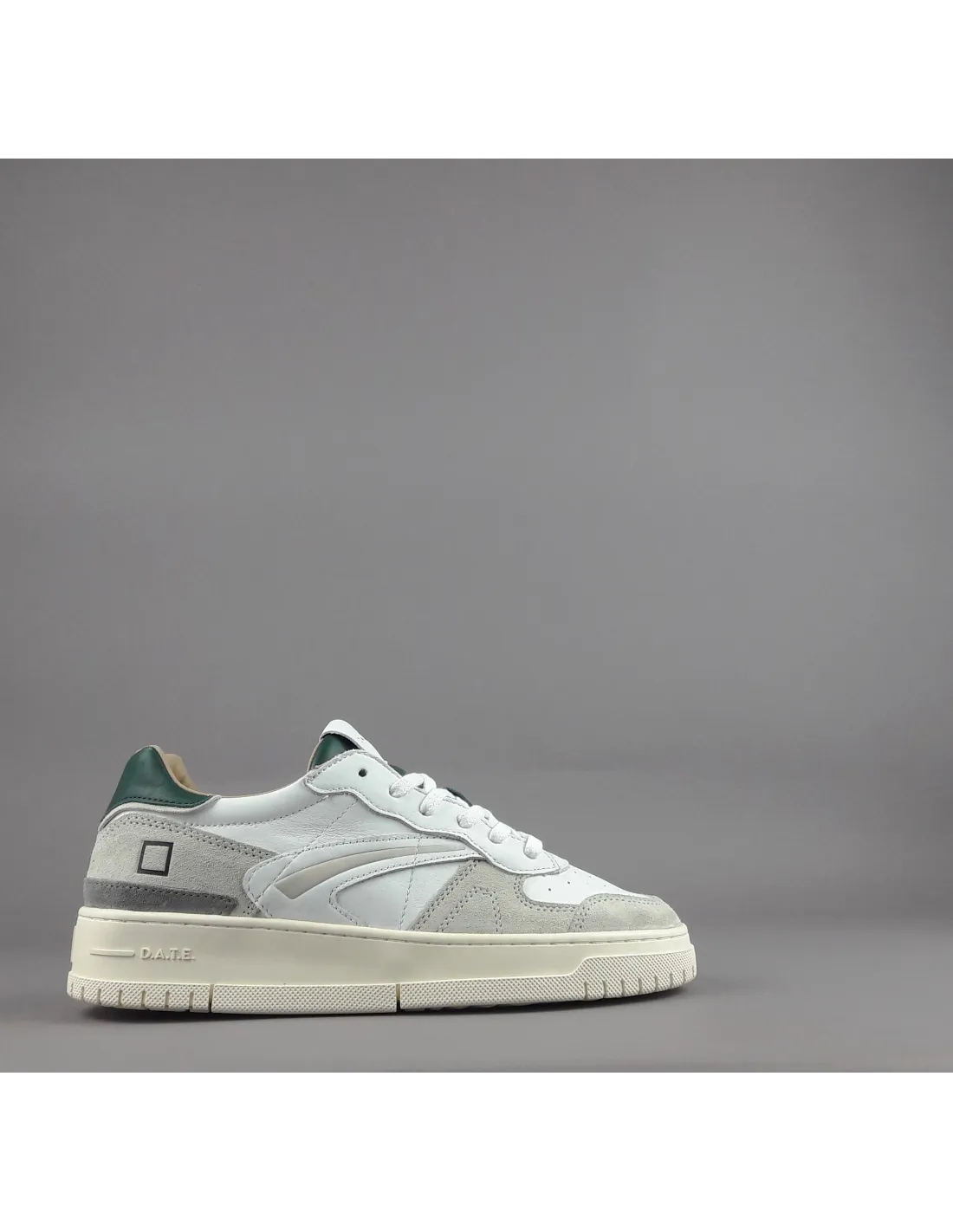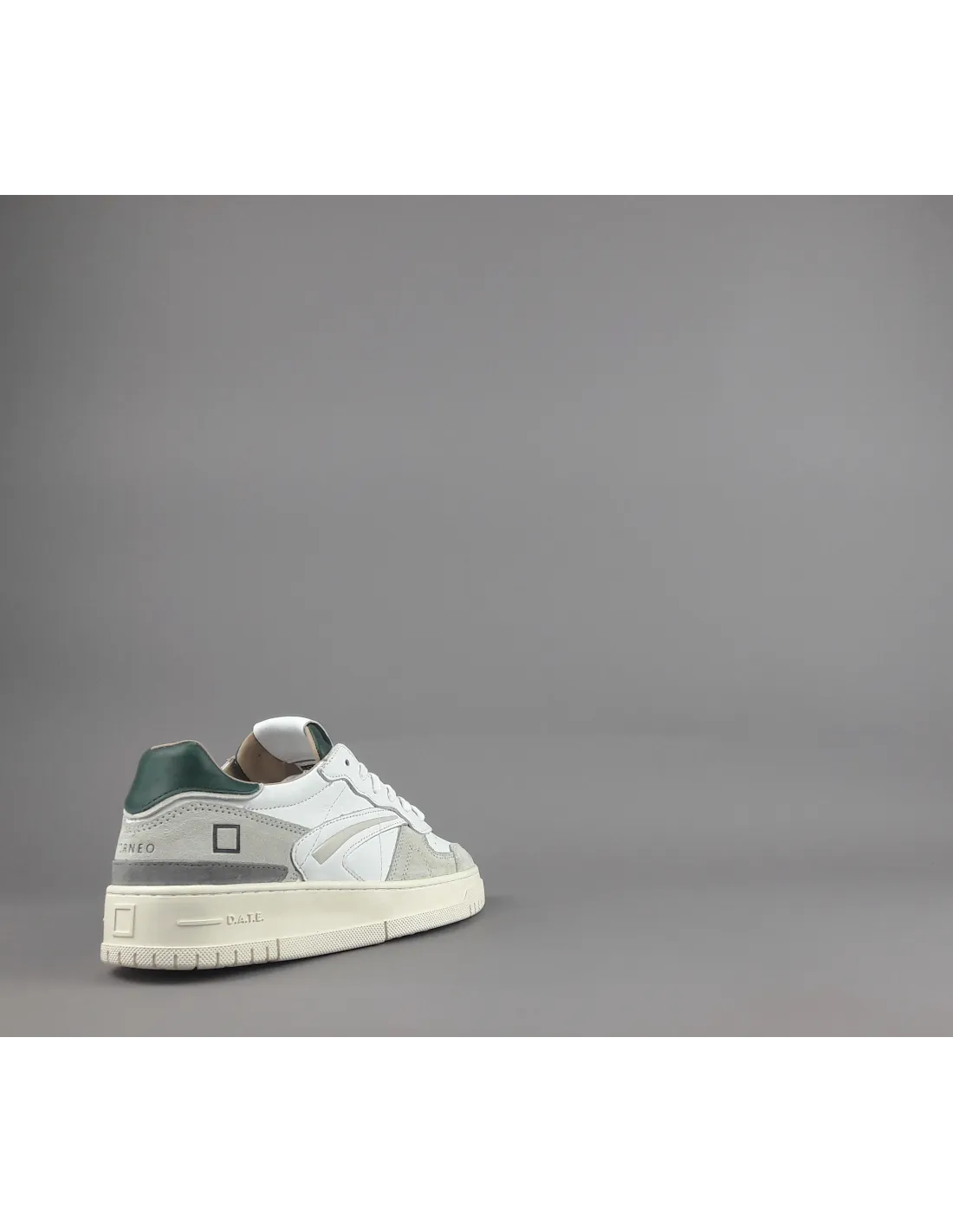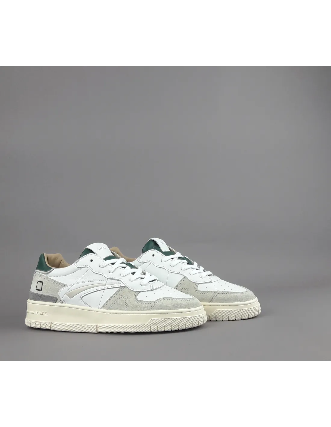 Collezione invernale, Sneakers uomo D.A.T.E. TORNEO in pelle bianco e camoscio ghiaccio, spoiler verde scuro, linguetta in pelle verde scuro, puntale in pelle bucato, logo laterale impresso, soletta interna removibile di 2,5 cm, suola in gomma.
