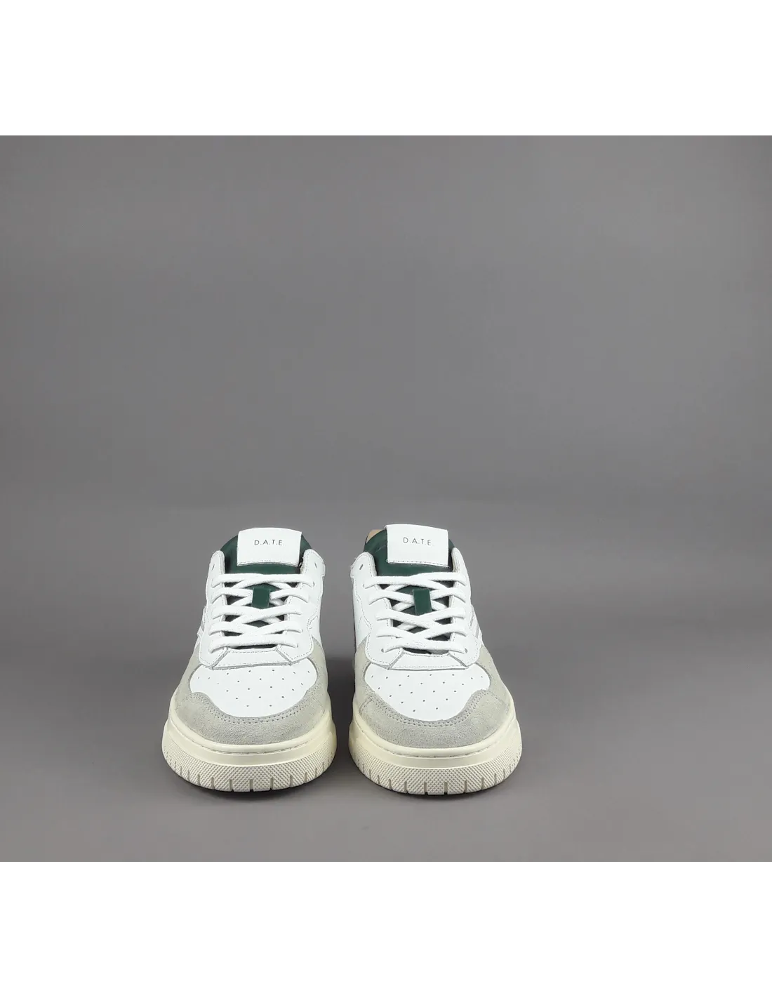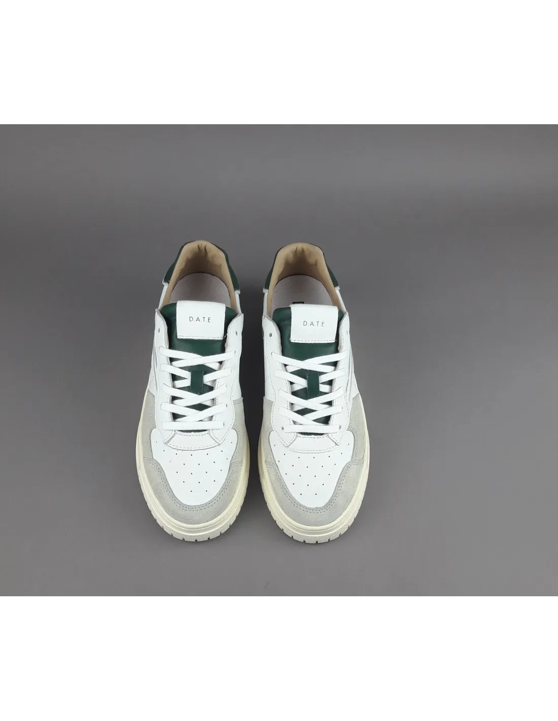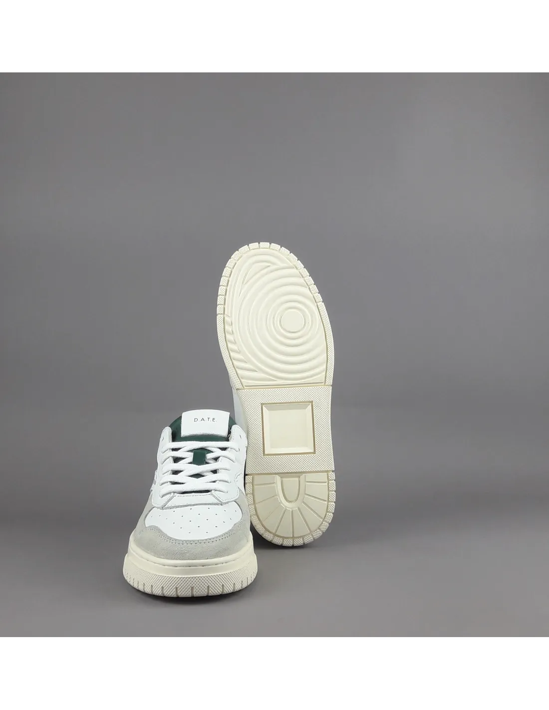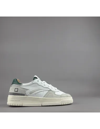 Collezione invernale, Sneakers uomo D.A.T.E. TORNEO in pelle bianco e camoscio ghiaccio, spoiler verde scuro, linguetta in pelle verde scuro, puntale in pelle bucato, logo laterale impresso, soletta interna removibile di 2,5 cm, suola in gomma.