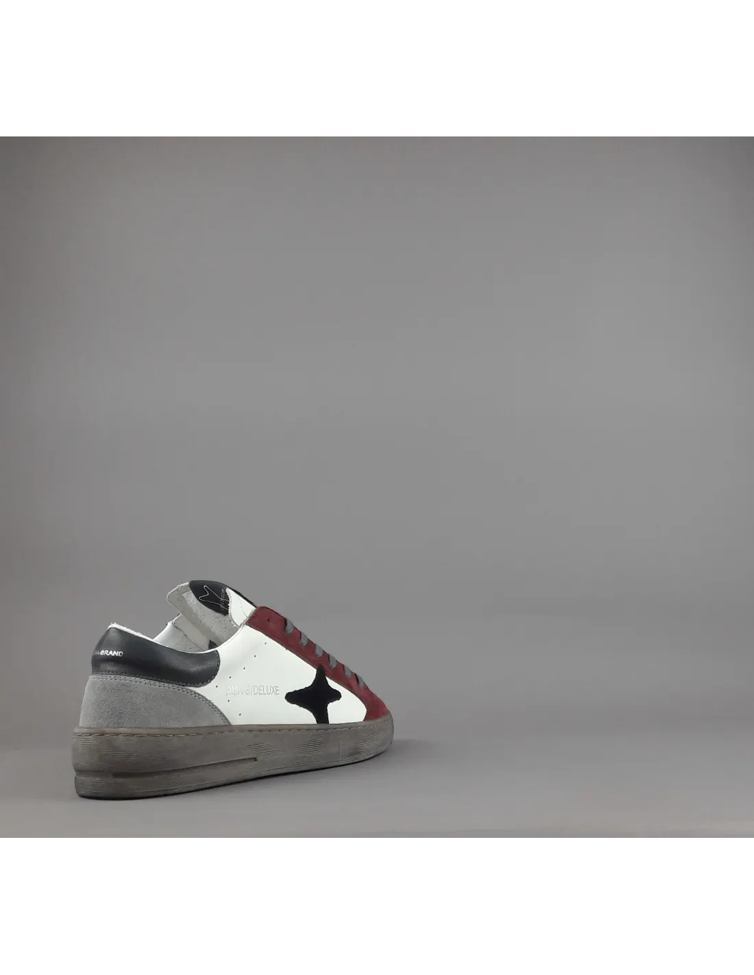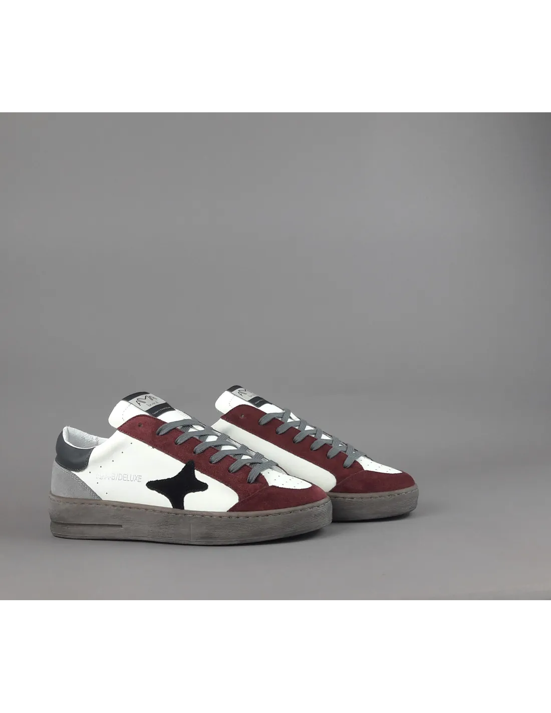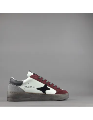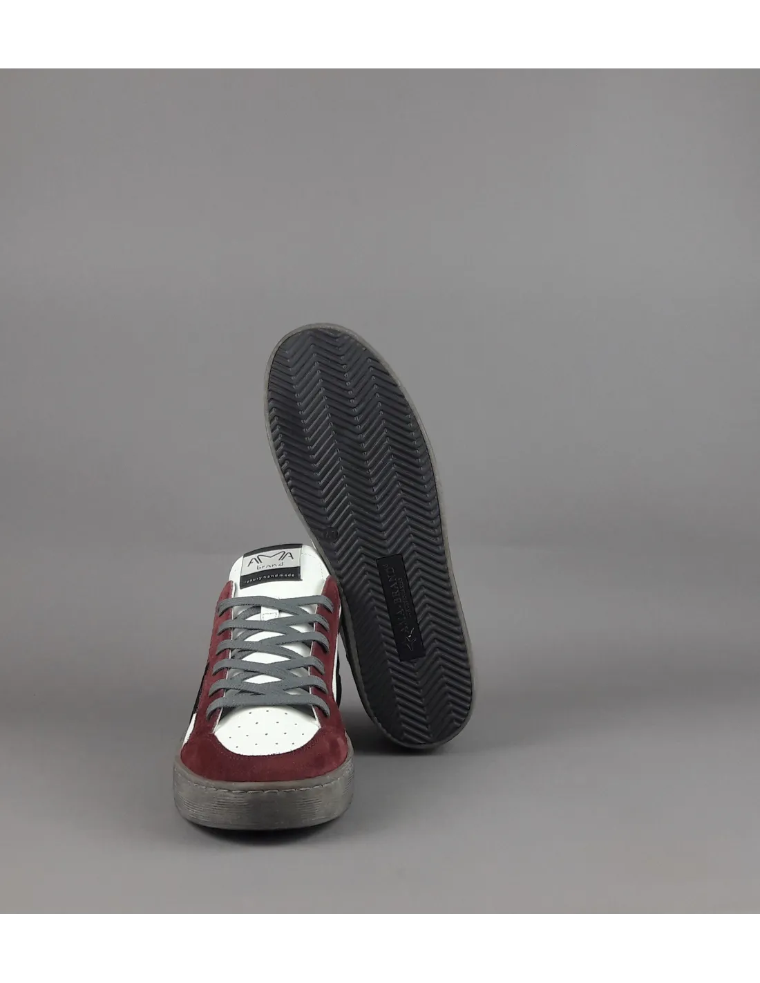 Collezione invernale, sneakers uomo slam, in camoscio bordeaux e pelle bianco, logo laterale in camoscio nero, spoiler tallone in pelle grigio, dettagli tallone in camoscio, fussbett estraibile, fondo cucito in gomma 4cm
