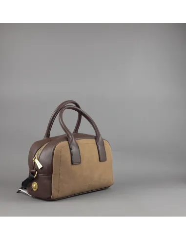 Collezione invernale, Gio Cellini borsa bauletto piccolo, in poliuretano e tessuto effetto camoscio cammello, doppio manico centrale, chiusura con cerniera, tracolla, logo stampato frontale