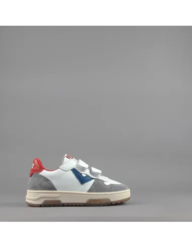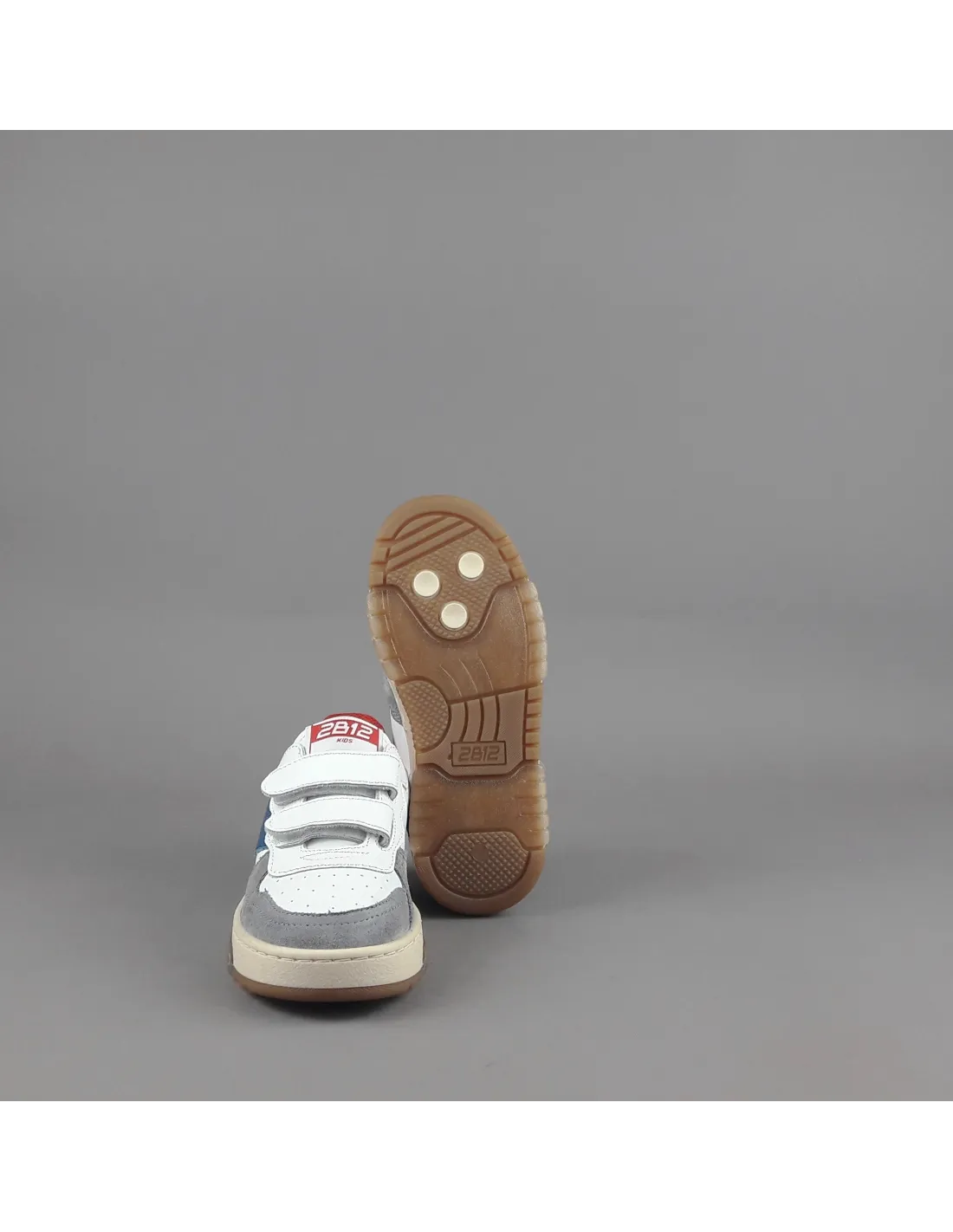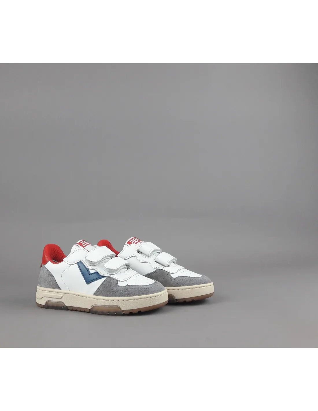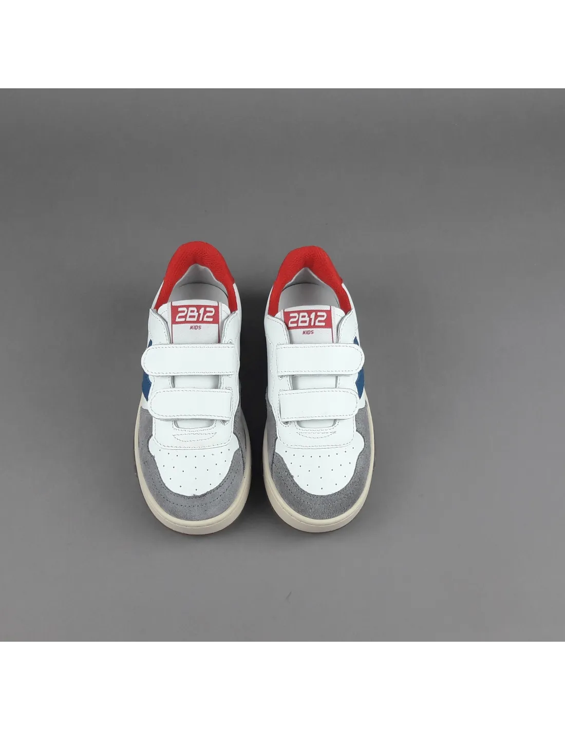 Collezione invernale, Sneakers JUNIOR HYPER 2B12 in pelle, dettagli in camoscio grigio, allacciatura con velcro, spoiler in pelle rosso, logo laterale in pelle blu, fondo cucito, soletta interna removibile, suola in gomma.