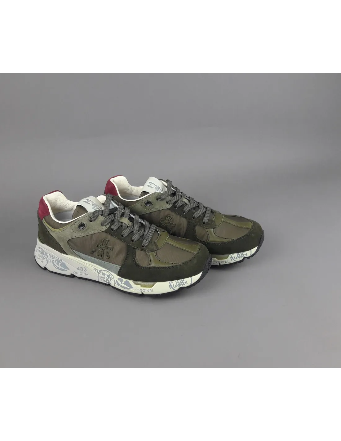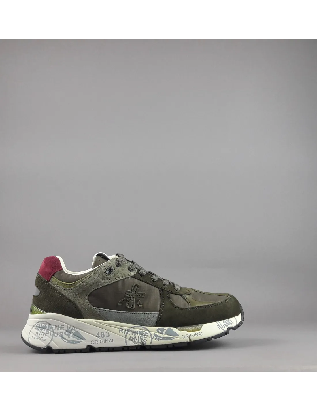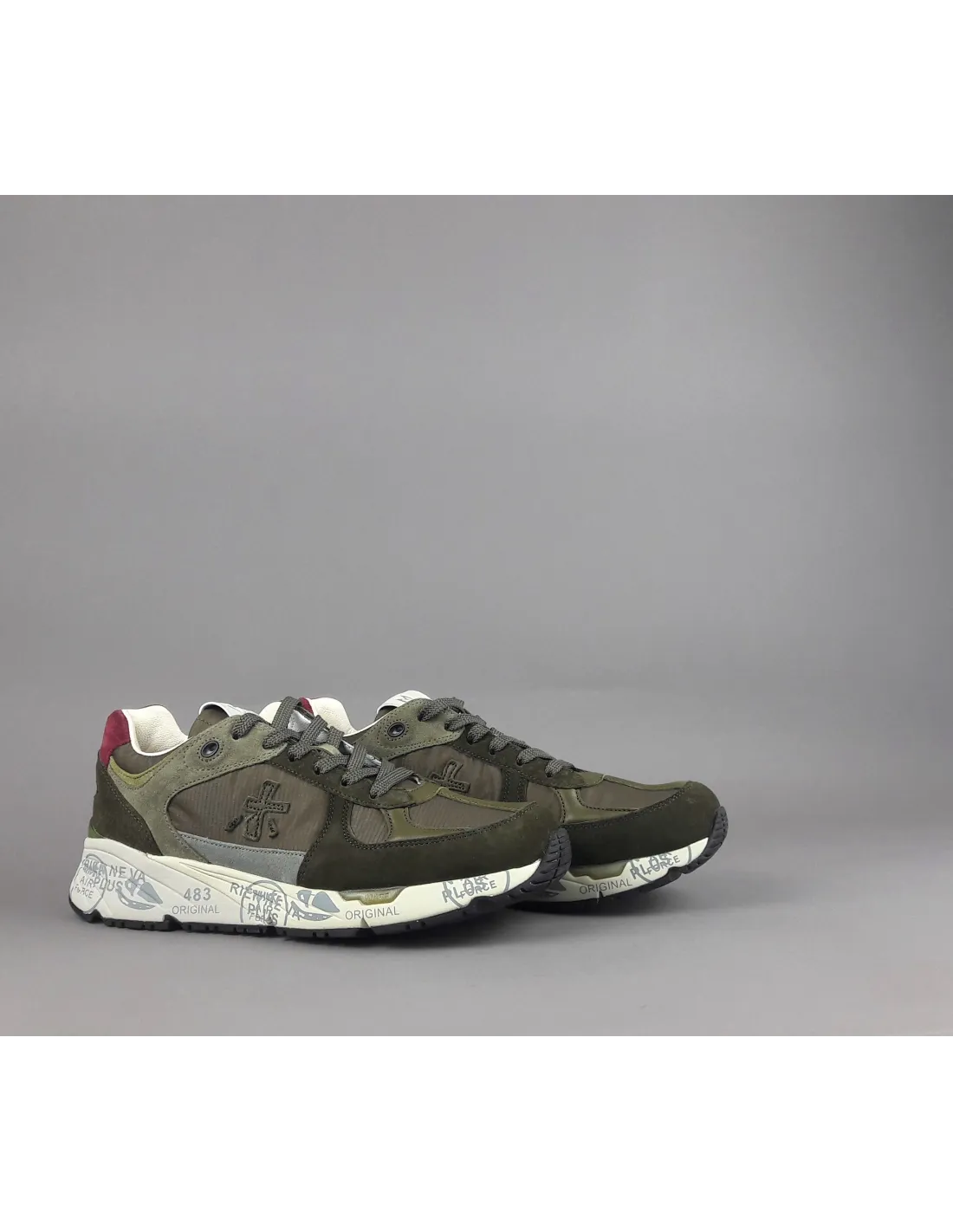 Collezione invernale, sneakers Premiata uomo Mase in camoscio e tela, spoiler in camoscio bordeaux, logo laterale in pelle, fodera interna in pelle, slash al tallone verde, fondo gomma