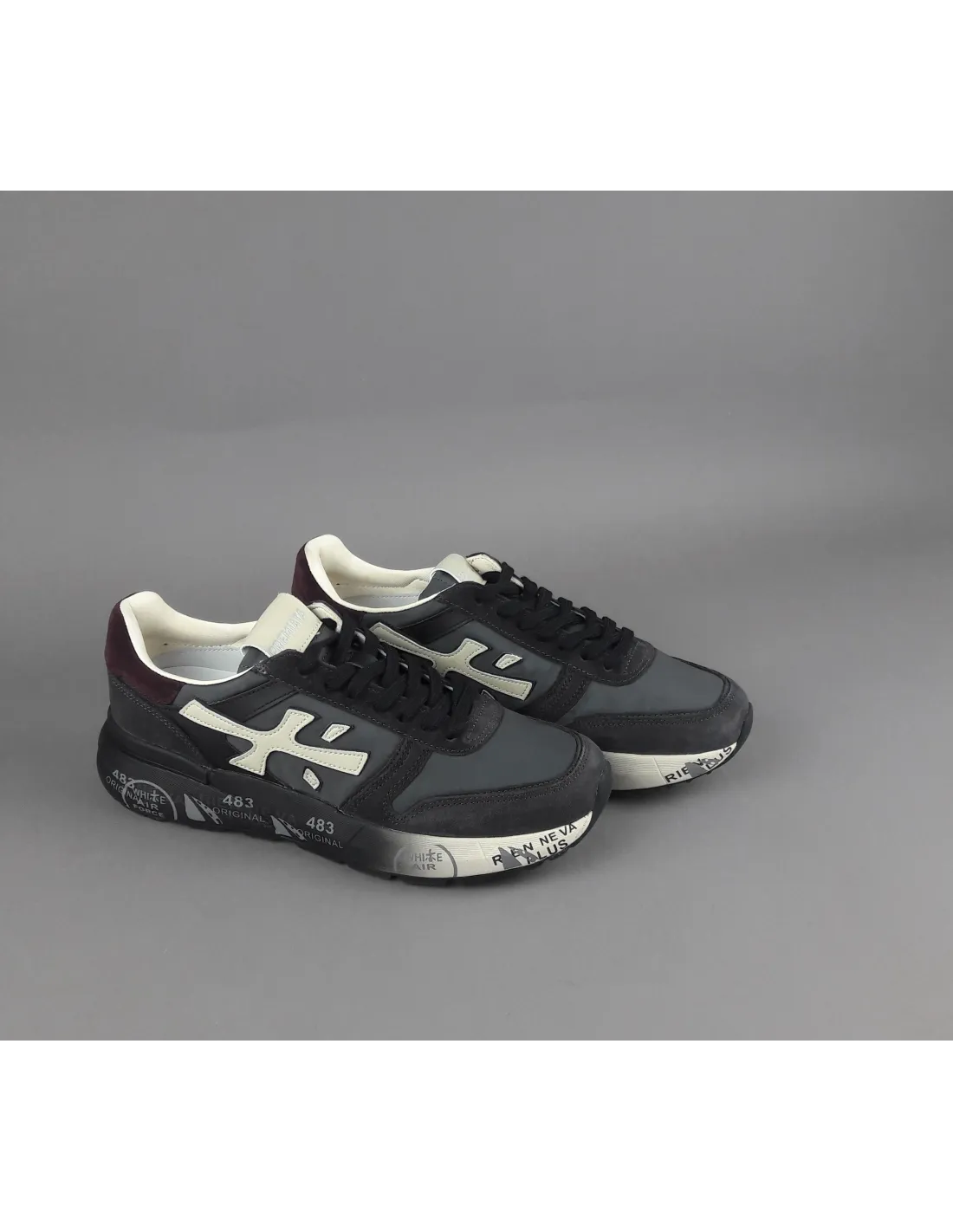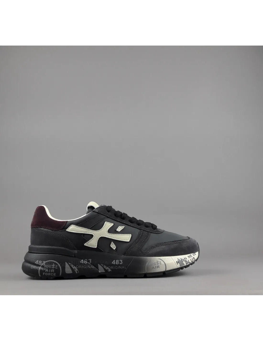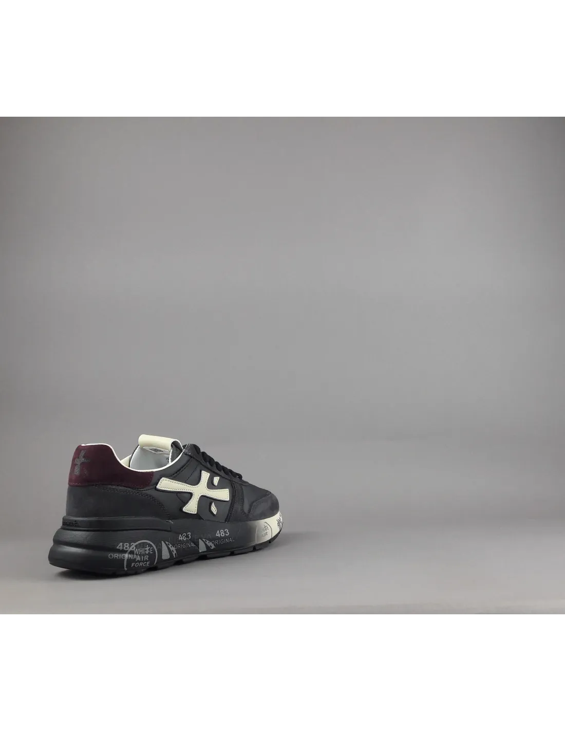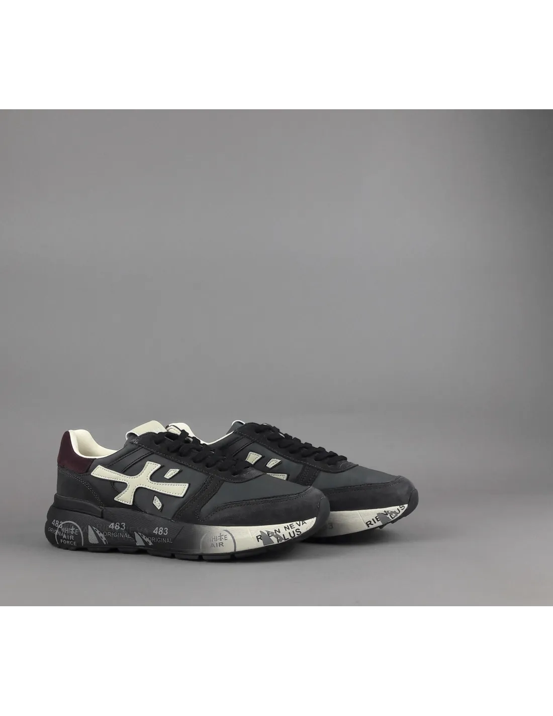 Collezione invernale, sneakers Premiata uomo Mick in camoscio nero, inserti in tela nero, spoiler in camoscio bordeaux, logo laterale in pelle avorio, fodera interna in pelle, fondo gomma.