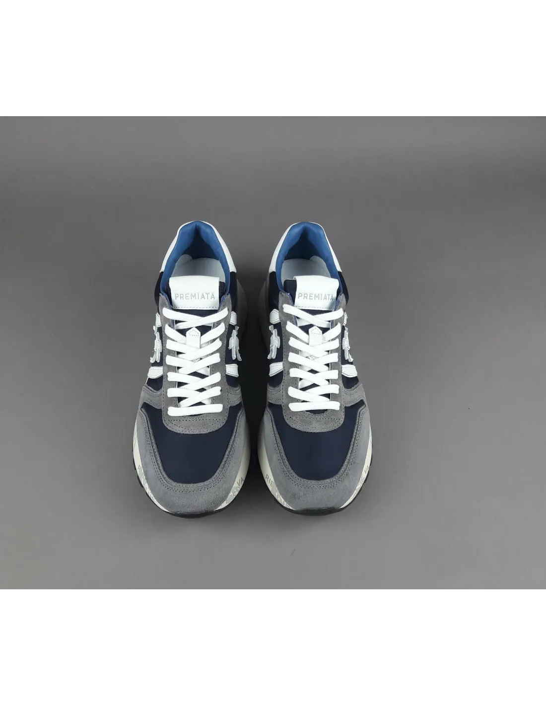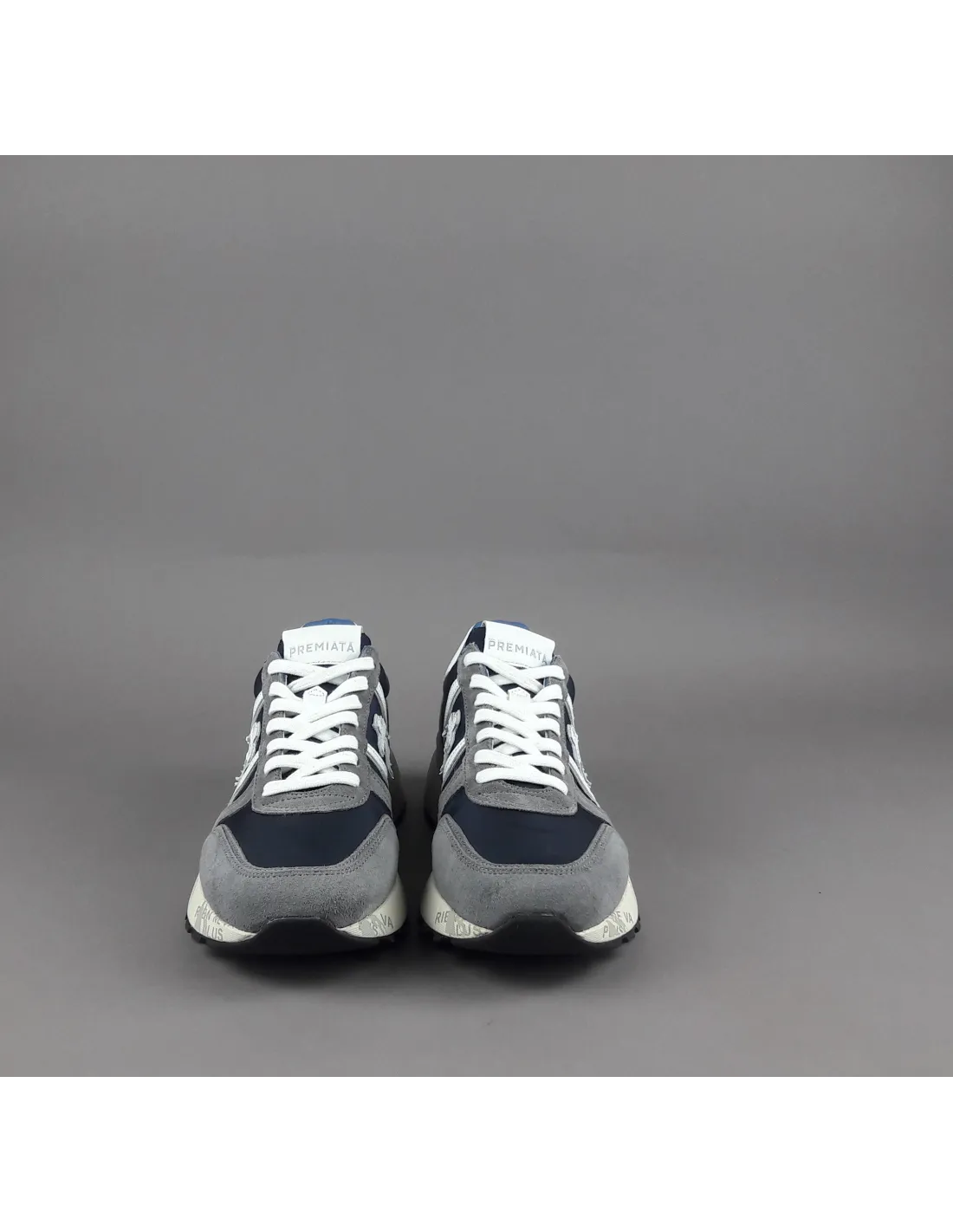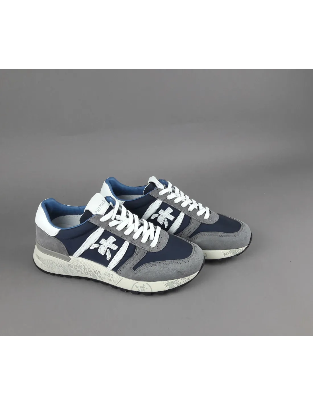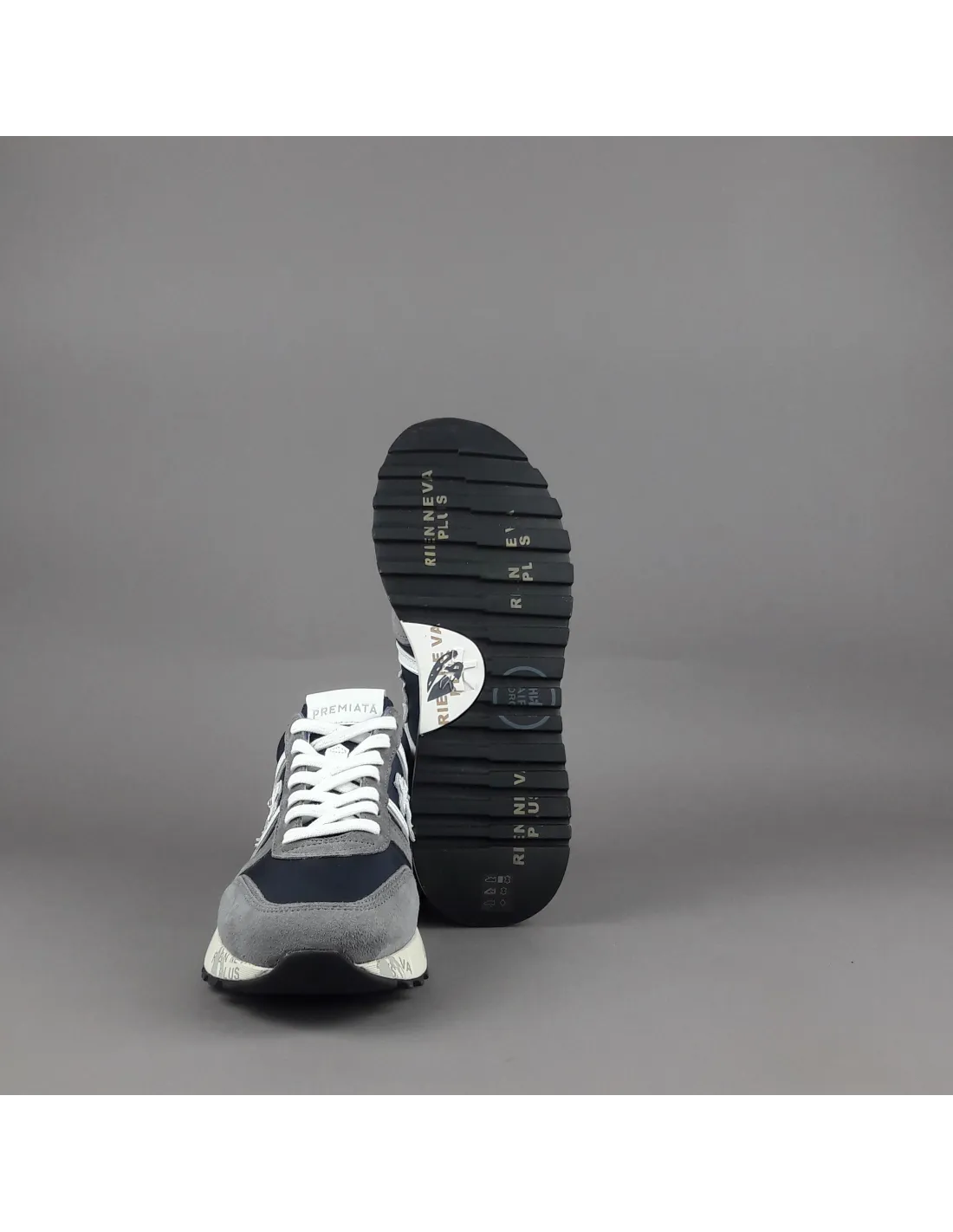 Collezione invernale, sneakers Premiata uomo Lander in camoscio grigio, inserti in tela blu scuro, spoiler in pelle bianco, logo laterale in pelle bianco, fodera interna in pelle, slash verde salvia, fondo gomma.