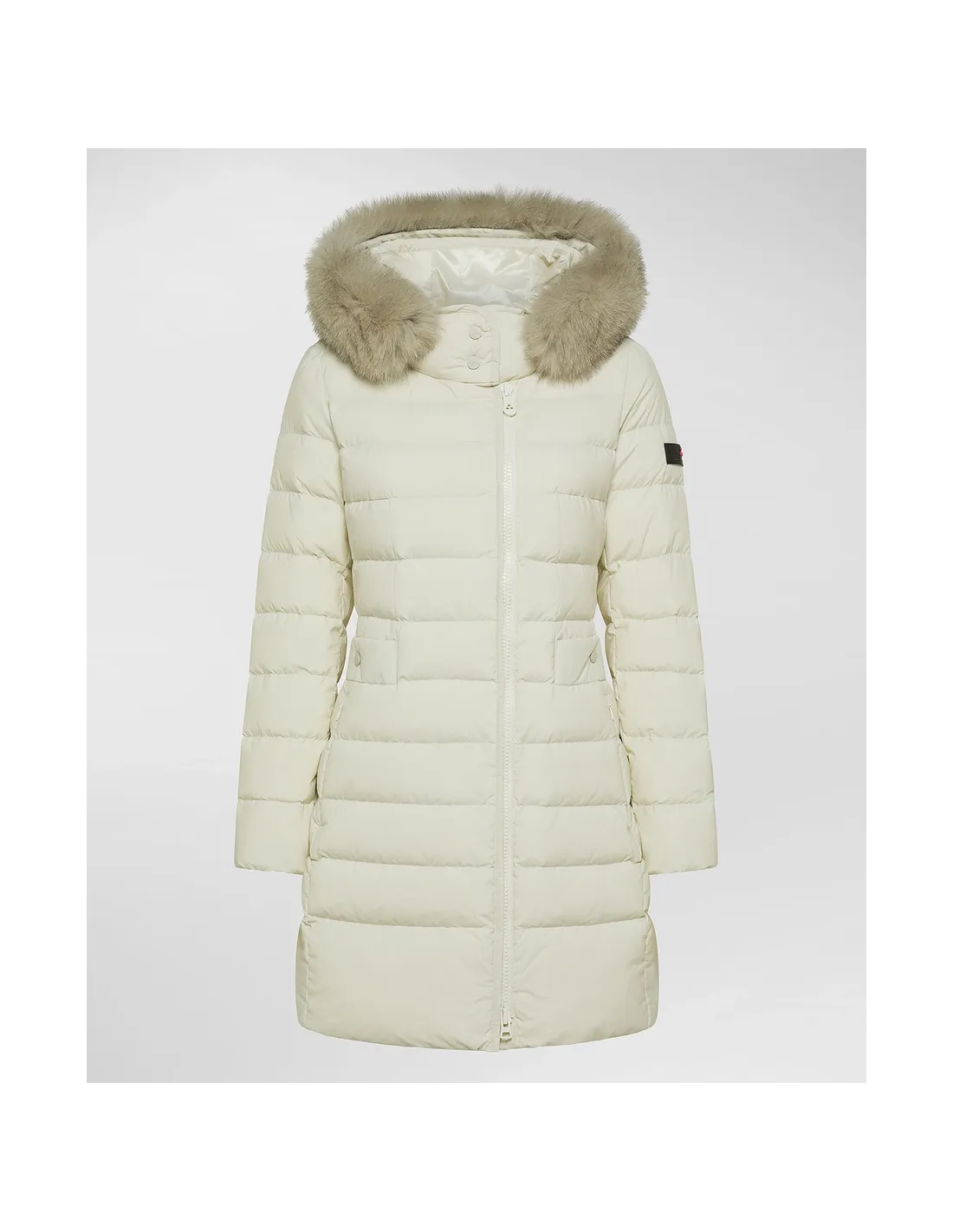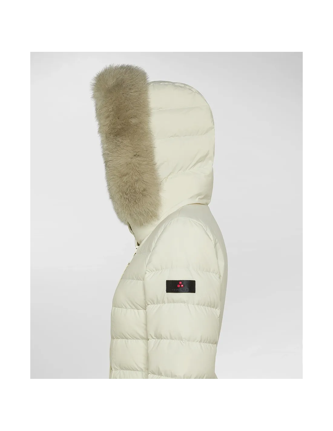 Collezione invernale, Piumino Seriola donna in tessuto tecnico, resistente all’acqua, full zip asimmetrica doppio cursore, tasche laterali, cappuccio bordato in volpe