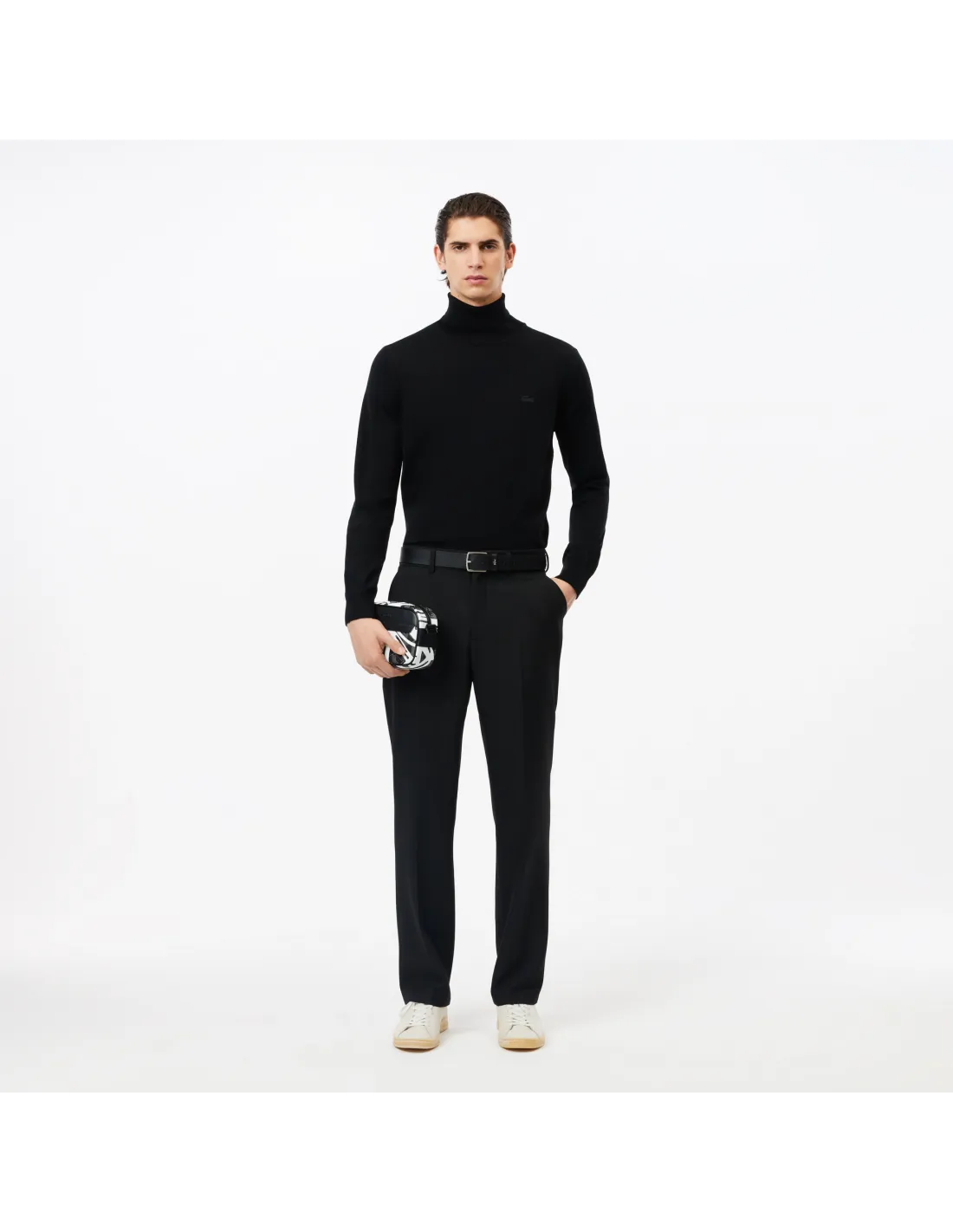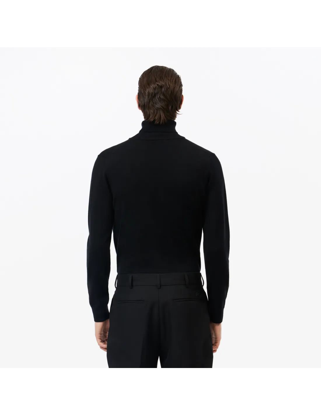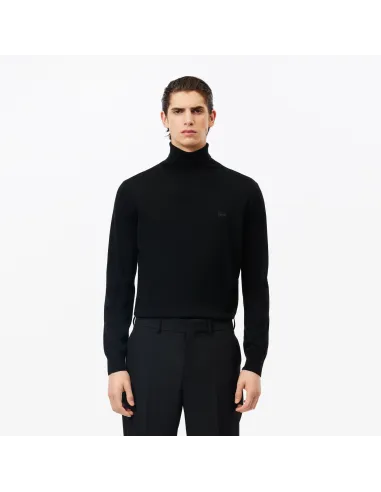 Collezione invernale, maglia pullover uomo in lana merino, collo alto con righe a contrasto sul collo, logo coccodrillo in tinta