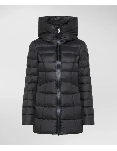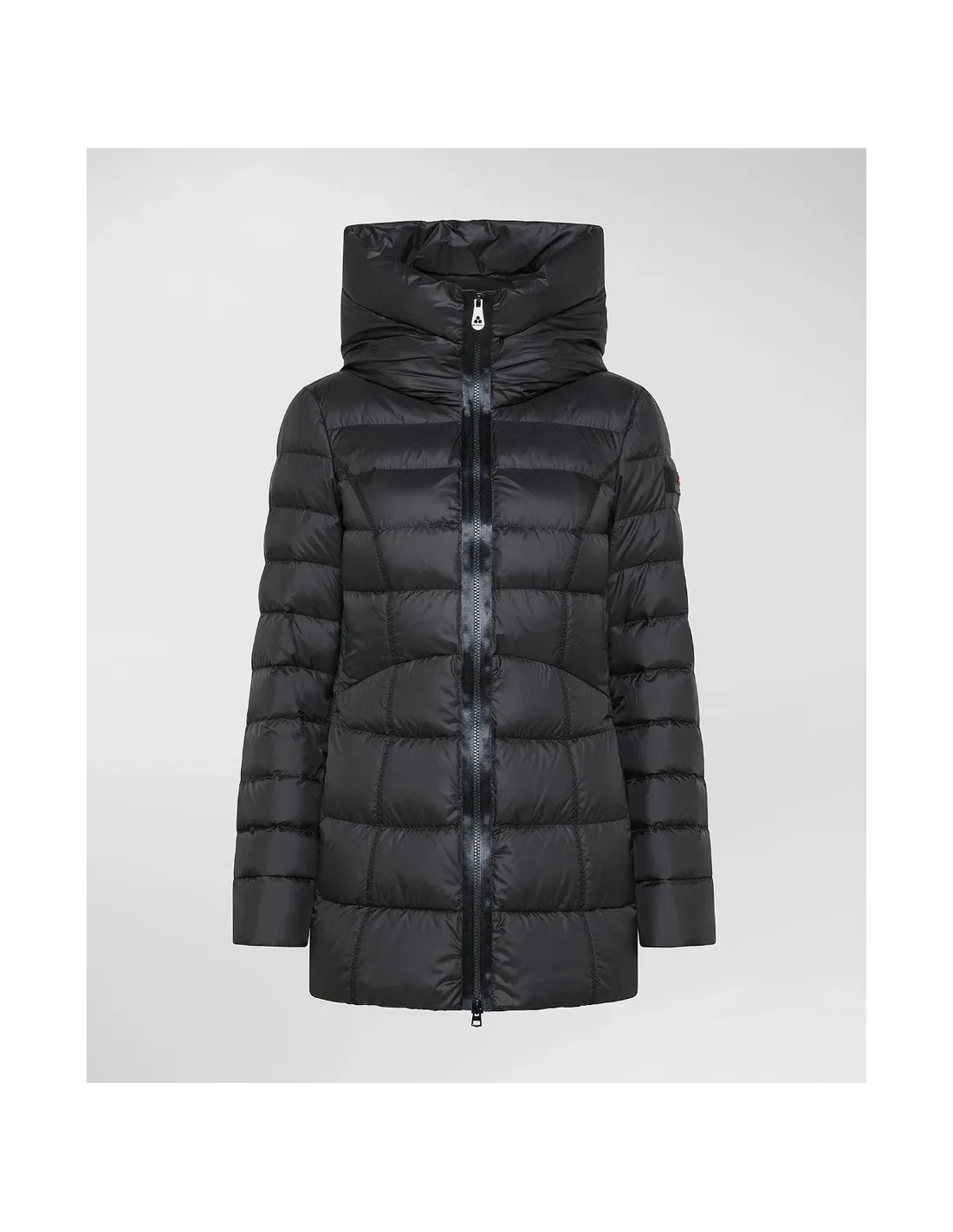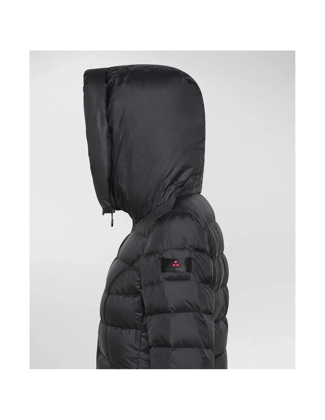 Collezione invernale, Piumino medio con trapunte sfalsate, tessuto resistente all’acqua, vestibilità slim a corpo, chiusura con zip nera a doppio cursore, vistoso collo a cratere con cappuccio, tasche laterali.