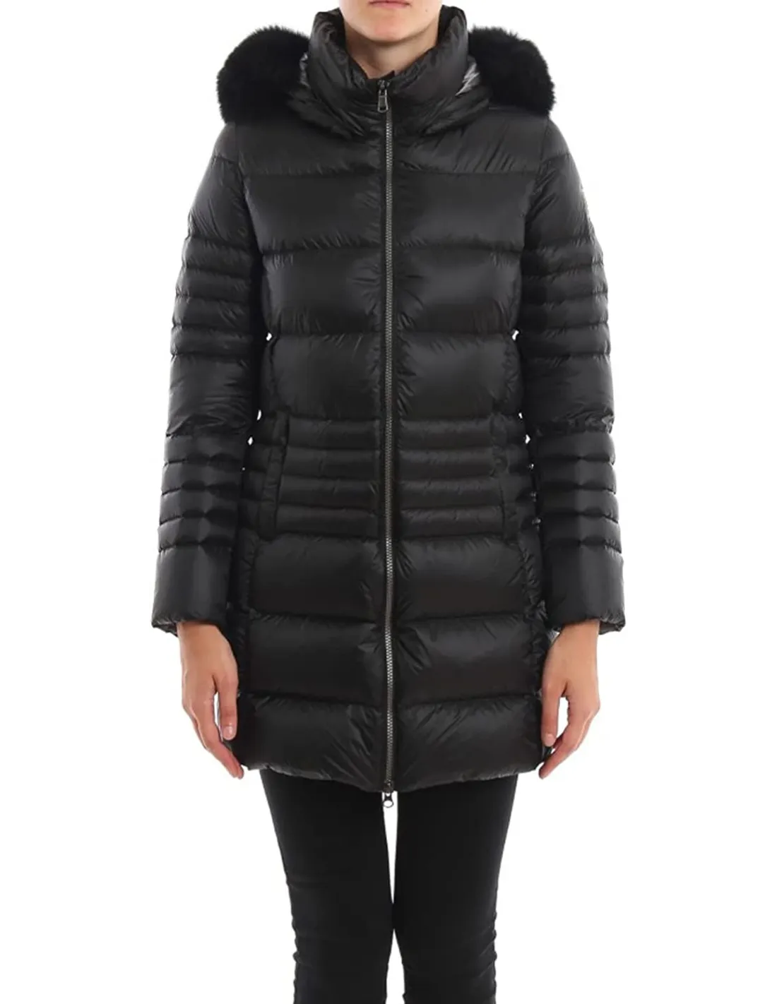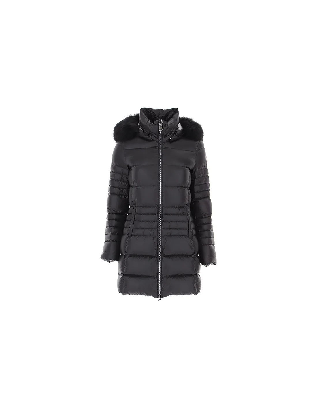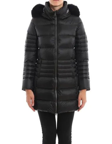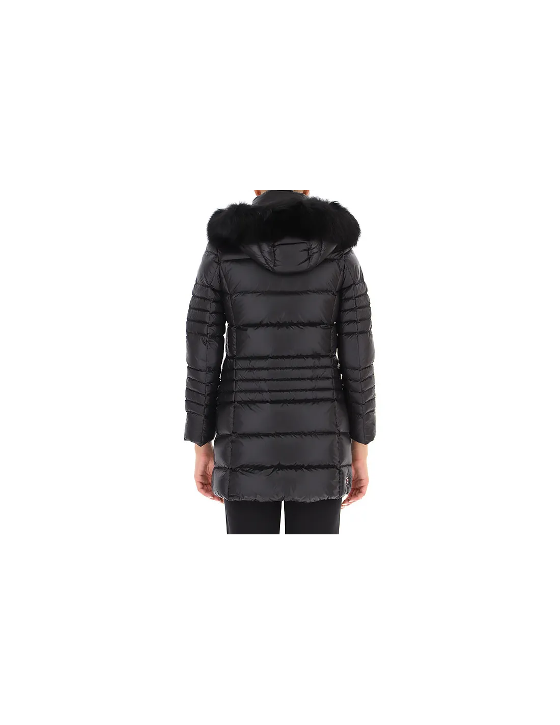 Collezione invernale, Piumino donna nylon cangiante riciclato trapuntato, chiusura con zip, cappuccio staccabile con bordo in pelliccia, imbottitura in piuma, logo Colmar applicato