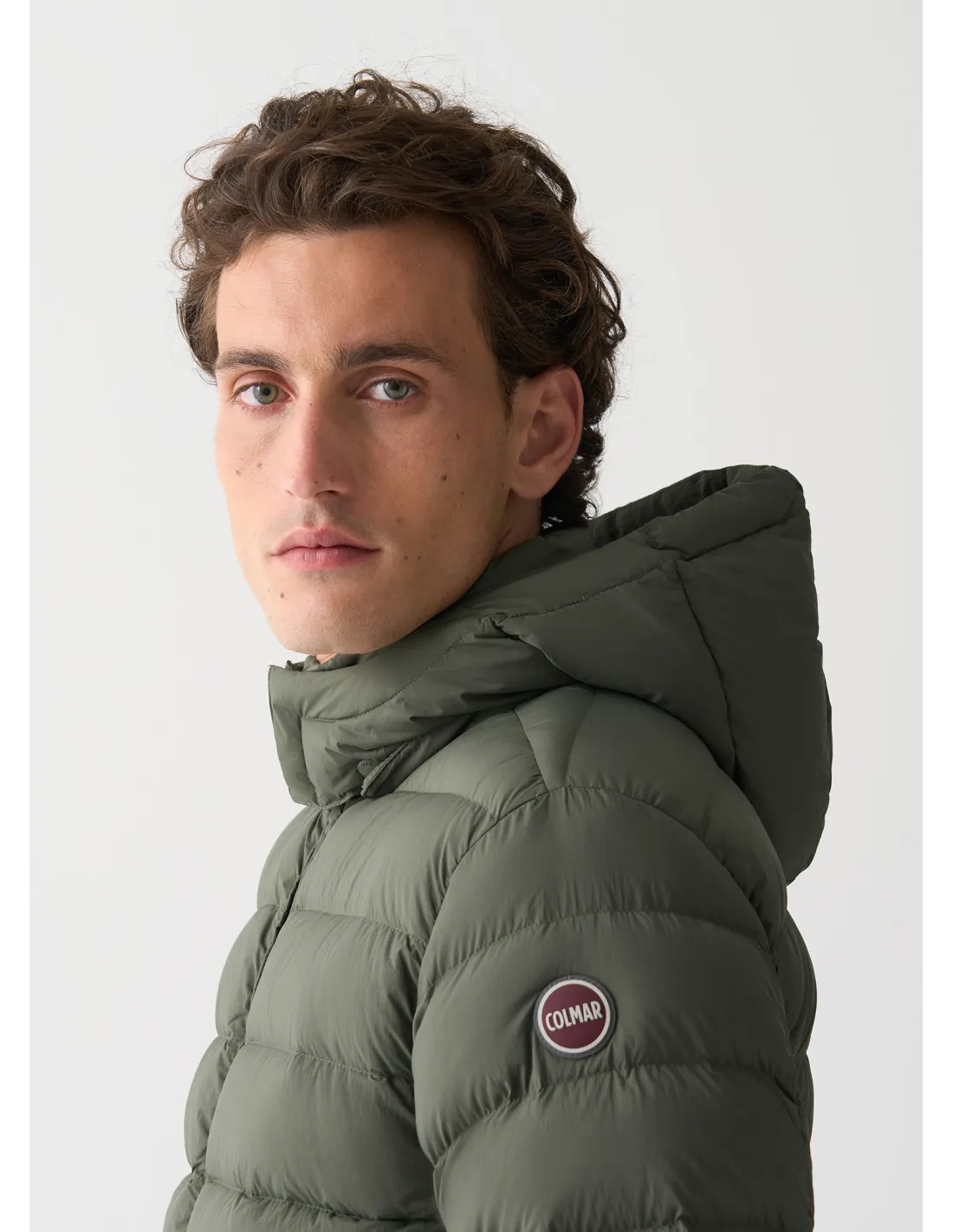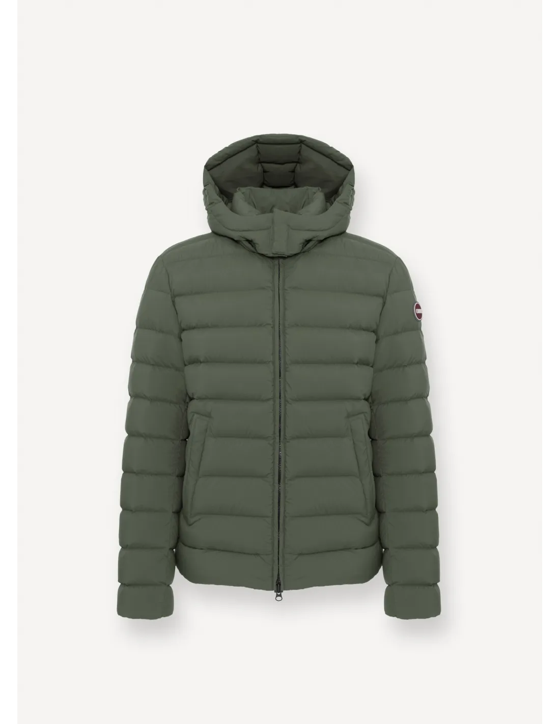 Collezione invernale, piumino uomo in nylon, chiusura con zip doppio cursore, cappuccio staccabile, coulisse al fondo, logo Colmar applicato