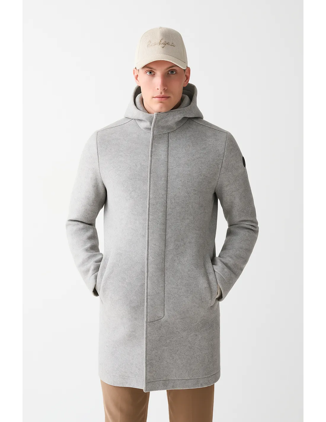 Collezione invernale, Cappotto uomo in panno di lana accoppiato a tessuto tipo neoprene, chiusura con zip e bottoni a pressione, cappuccio fisso, logo Colmar applicato