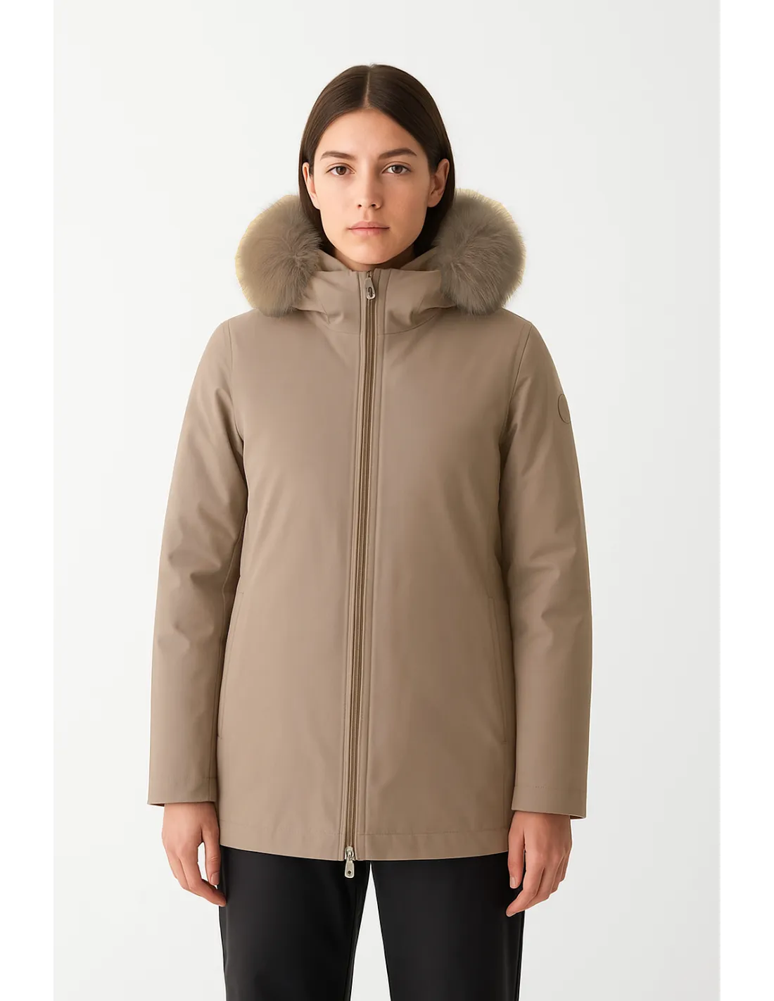 Collezione invernale, Giacca donna Colmar, realizzata in tessuto elasticizzato ed imbottito in piuma naturale, interno trapuntato lucido, con cappuccio fisso e eco pelliccia staccabile.
