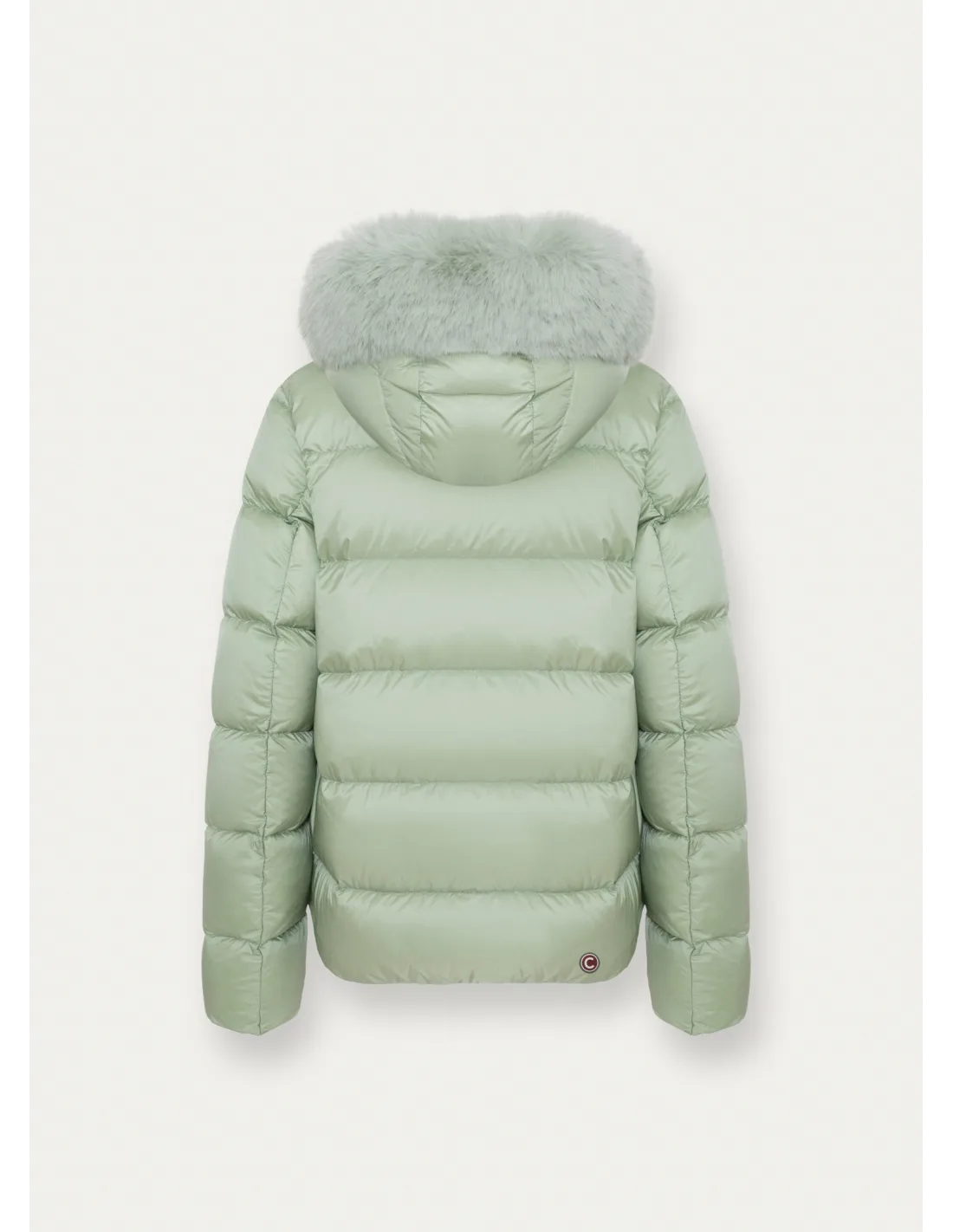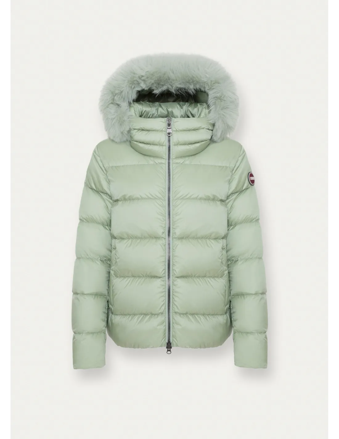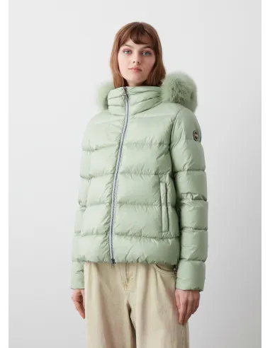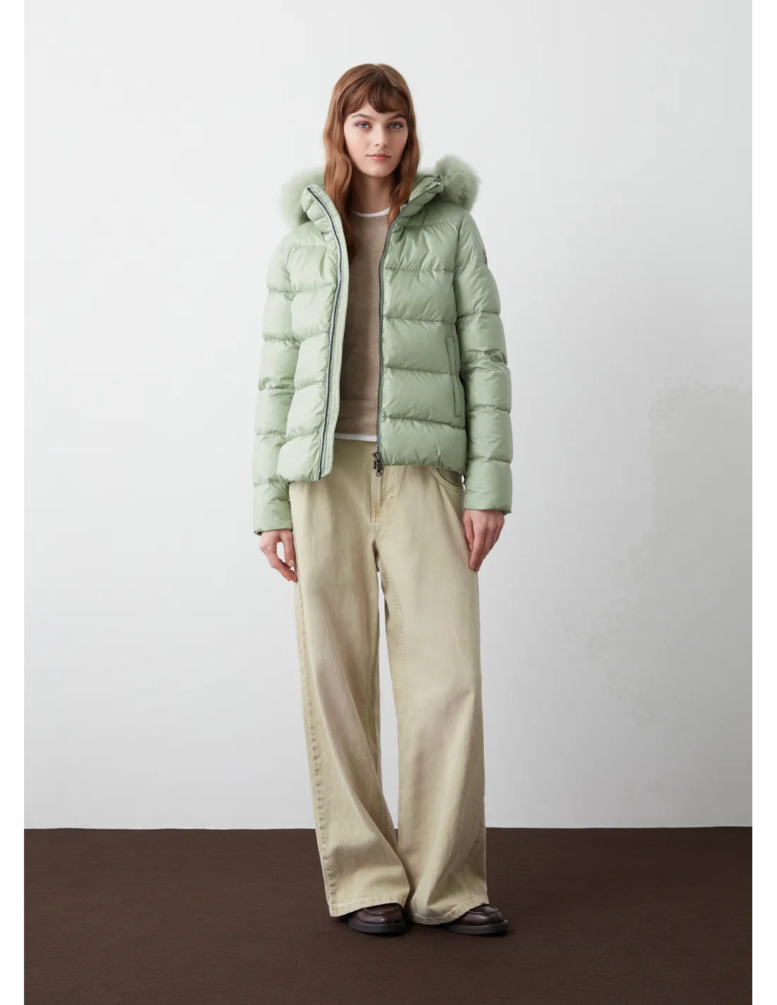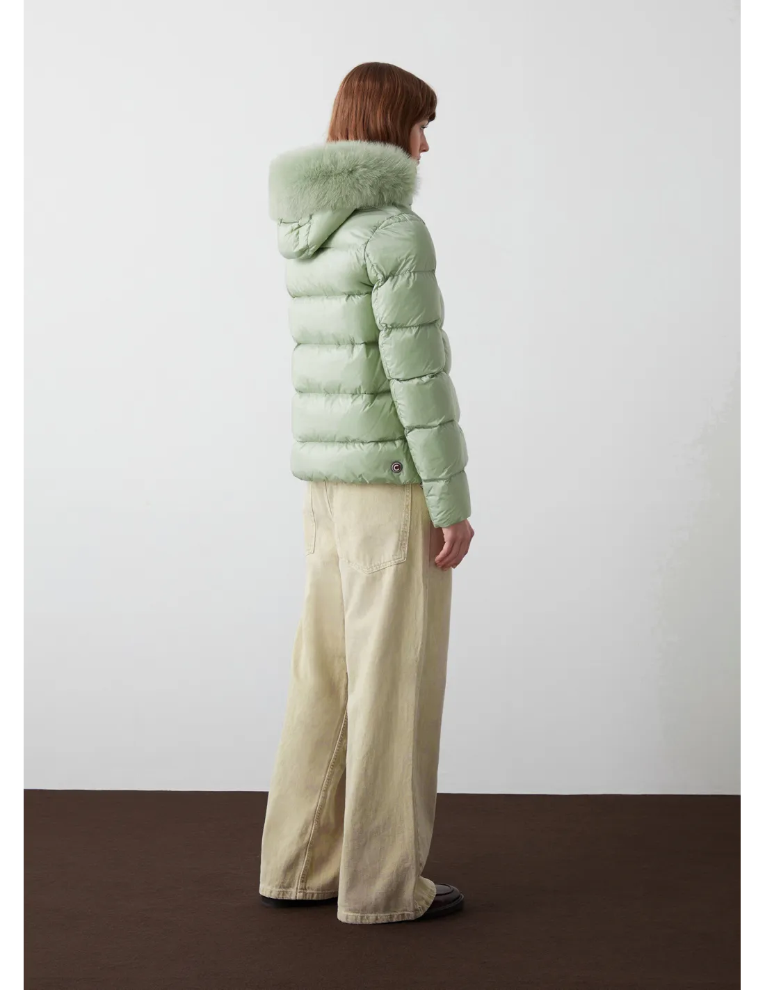 Collezione invernale, piumino corto con cappuccio staccabile con zip, bordo in pelliccia, tessuto idrorepellente ed imbottita in piuma naturale, chiusura con zip doppio cursore.
