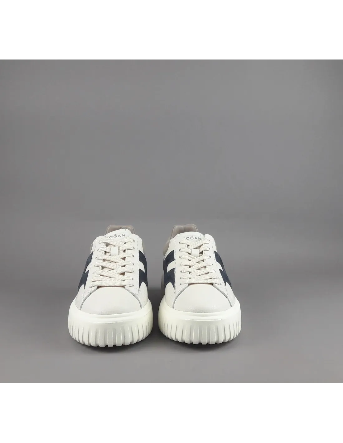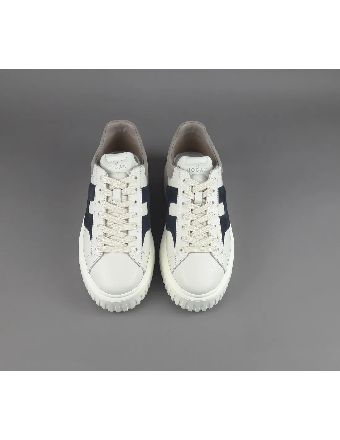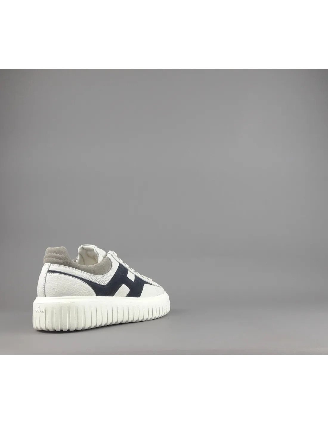 Collezione estiva, Sneakers H645 uomo in pelle bottalata, H laterale stripes in camoscio blu scuro, spoiler in camoscio talpa, foussbett in memory foam, suola in gomma.