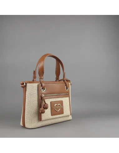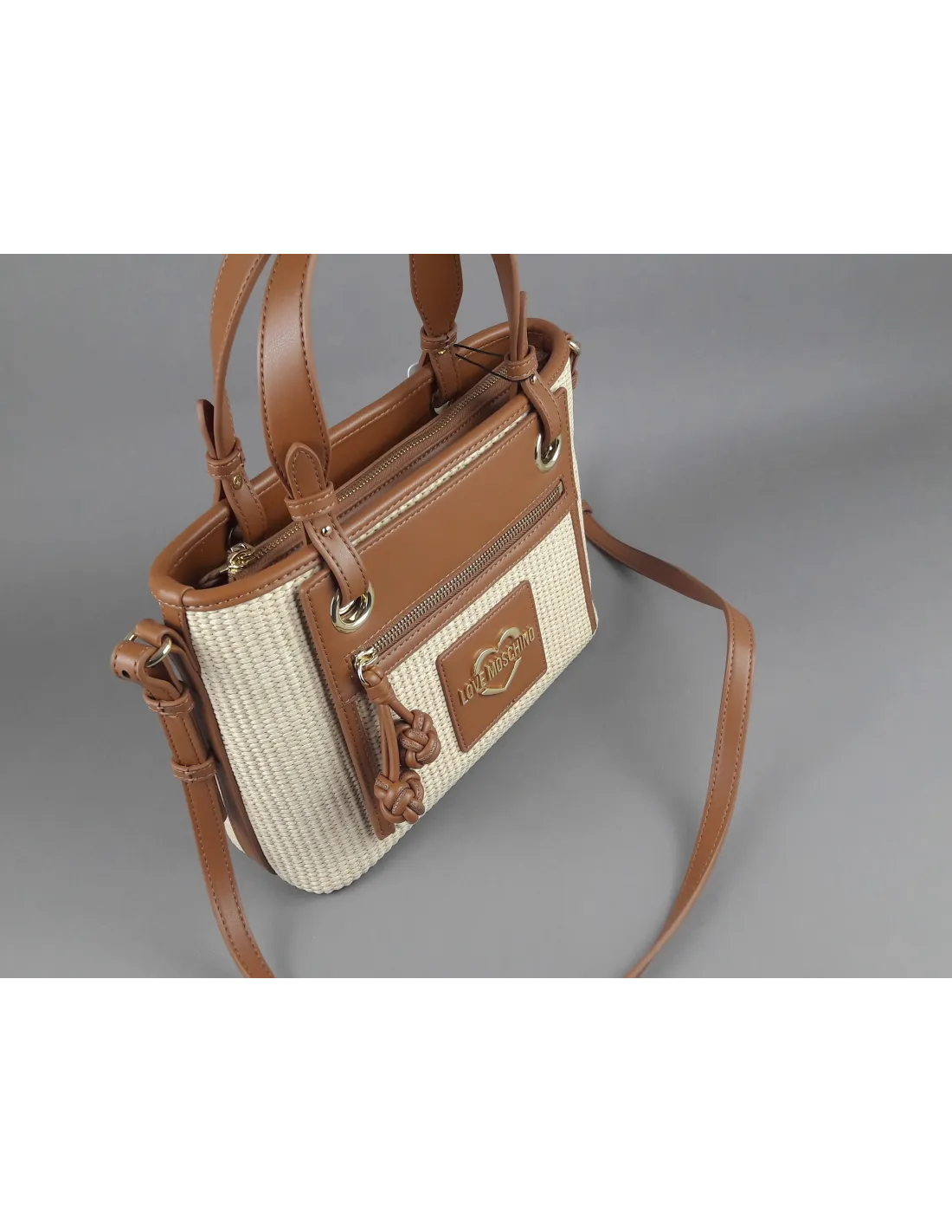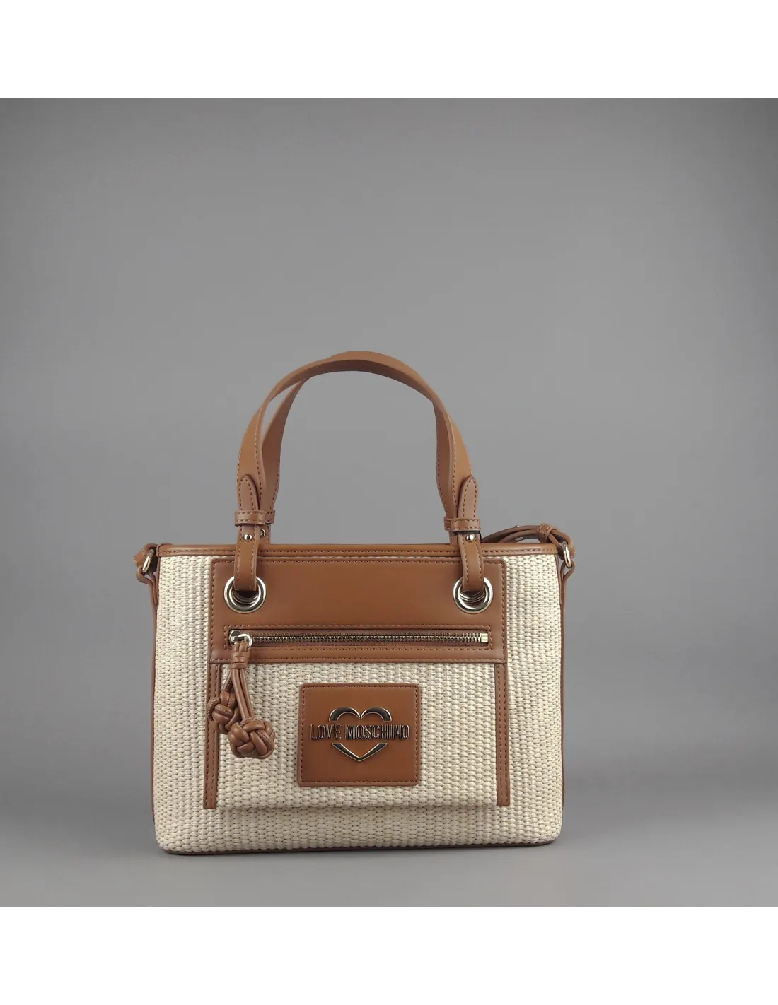Collezione estiva, borsa a mano donna in poliuretano e rafia, doppio manico in pu, tracolla, chiusura con cerniera, logo in metallo frontale