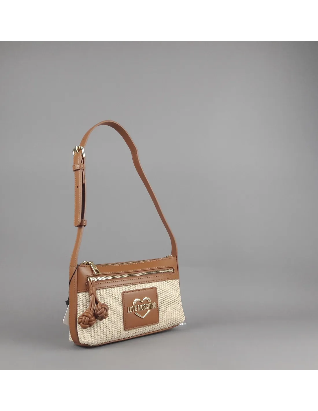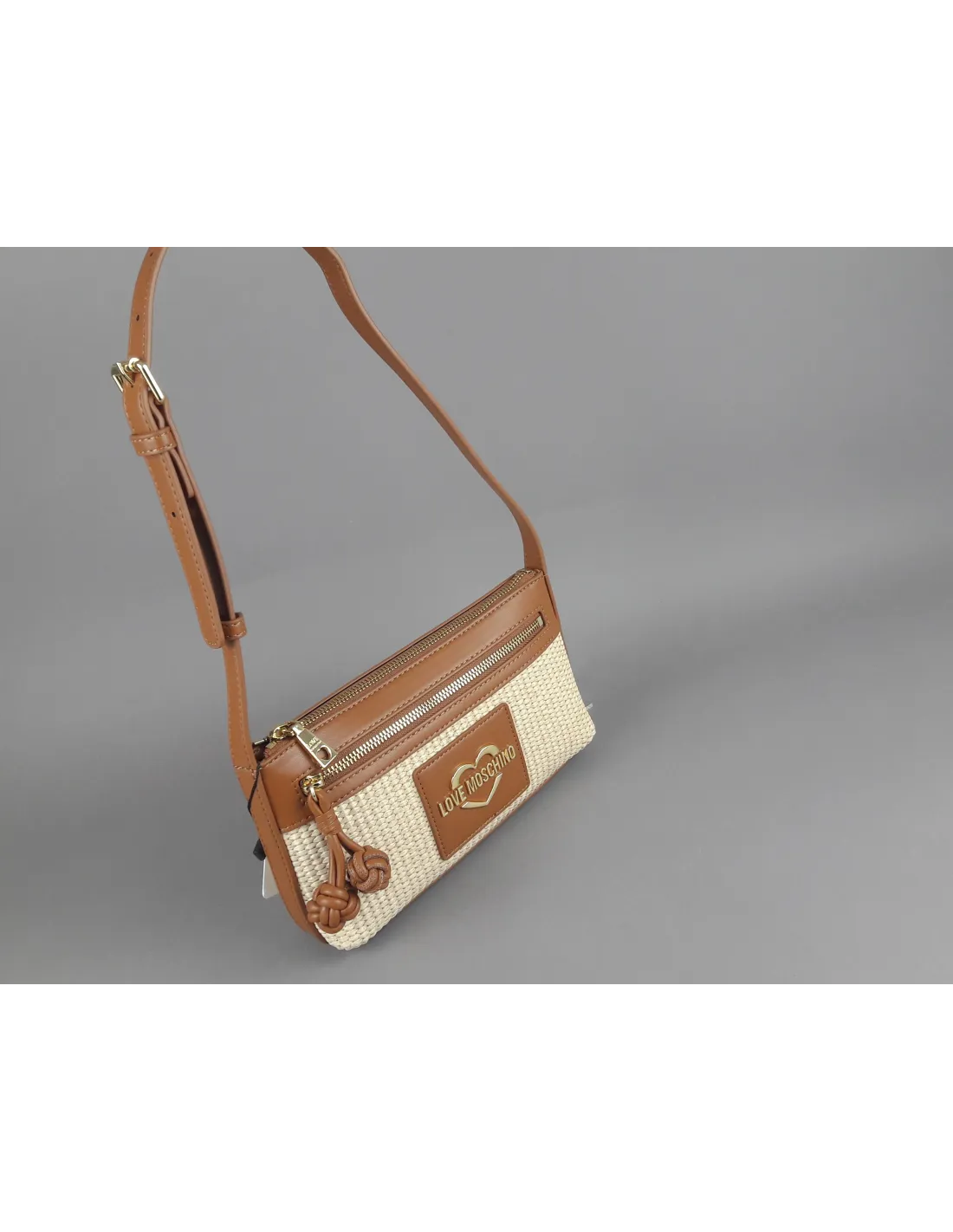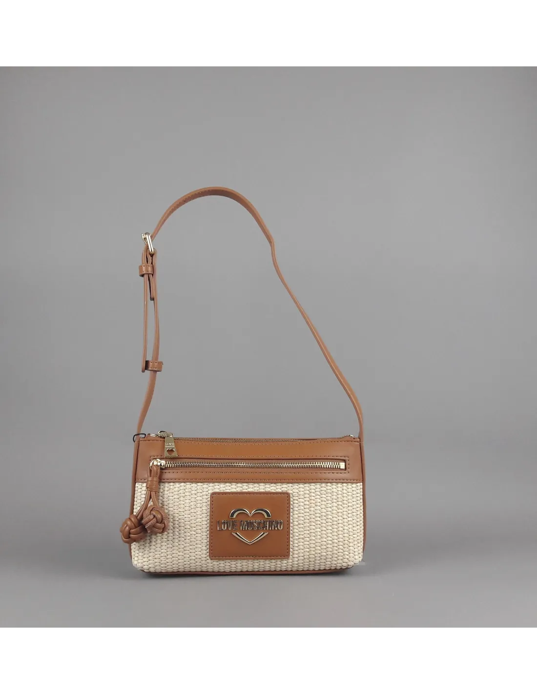 Collezione estiva, borsa a spalla donna in poliuretano e rafia, tracolla fissa in pu, chiusura con cerniera, logo in metallo frontale