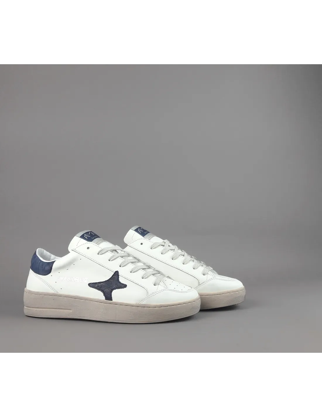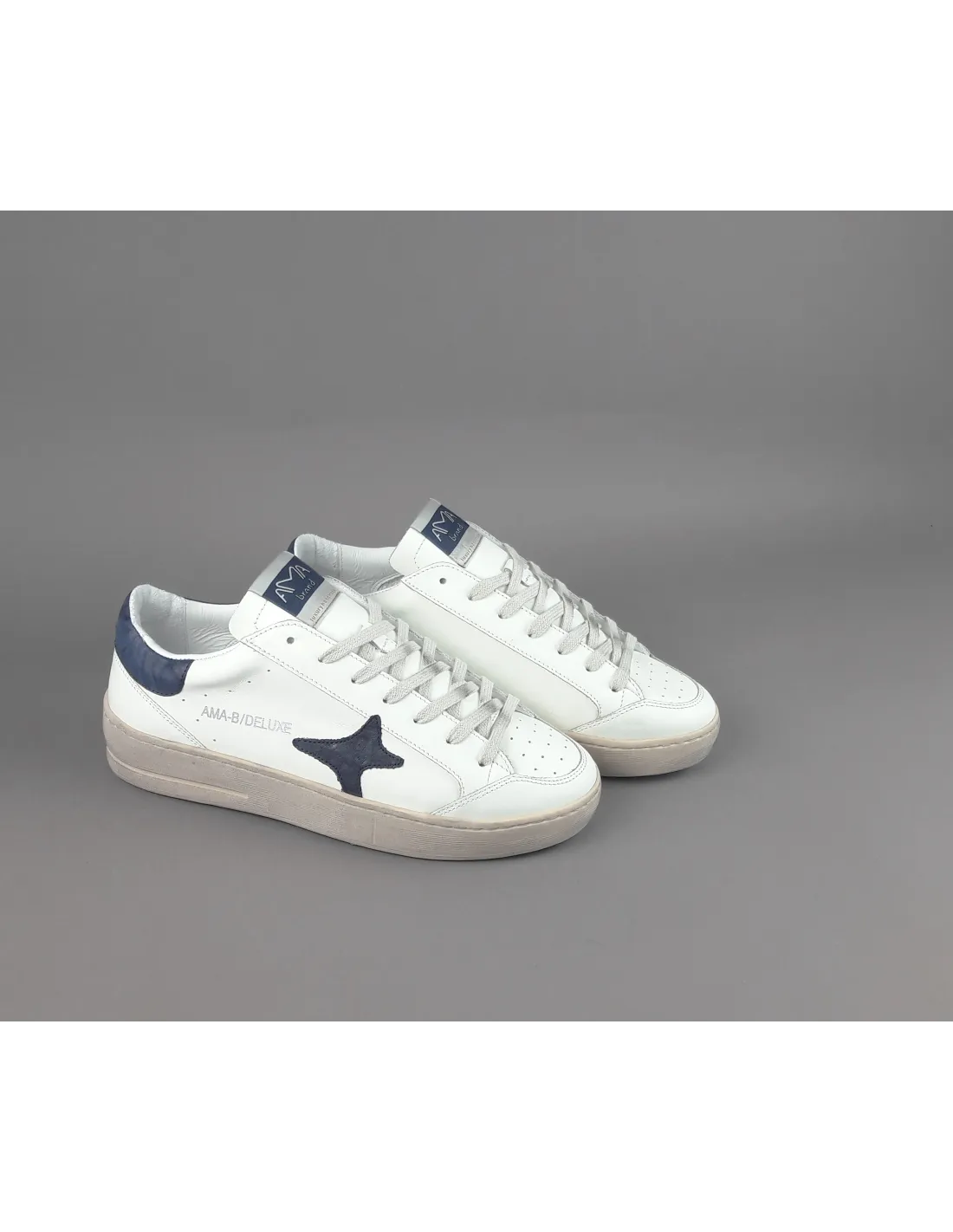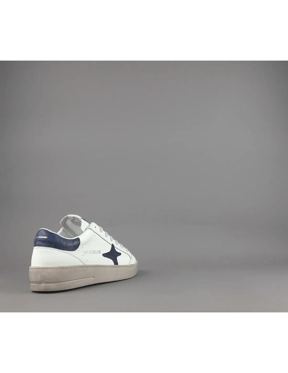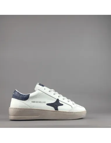 Ama Brand collezione estiva, sneakers uomo slam, in pelle bianco, logo laterale in pelle blu scuro, spoiler tallone in pelle blu scuro, logo lettering stampato al tallone, fussbett estraibile, fondo gomma 4cm.