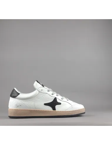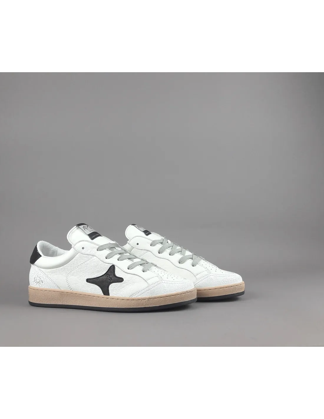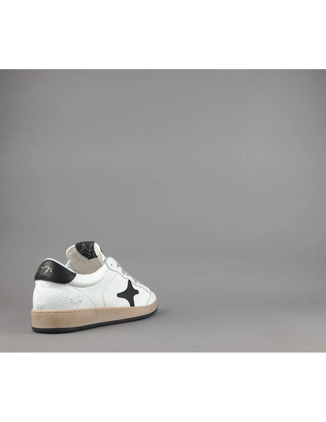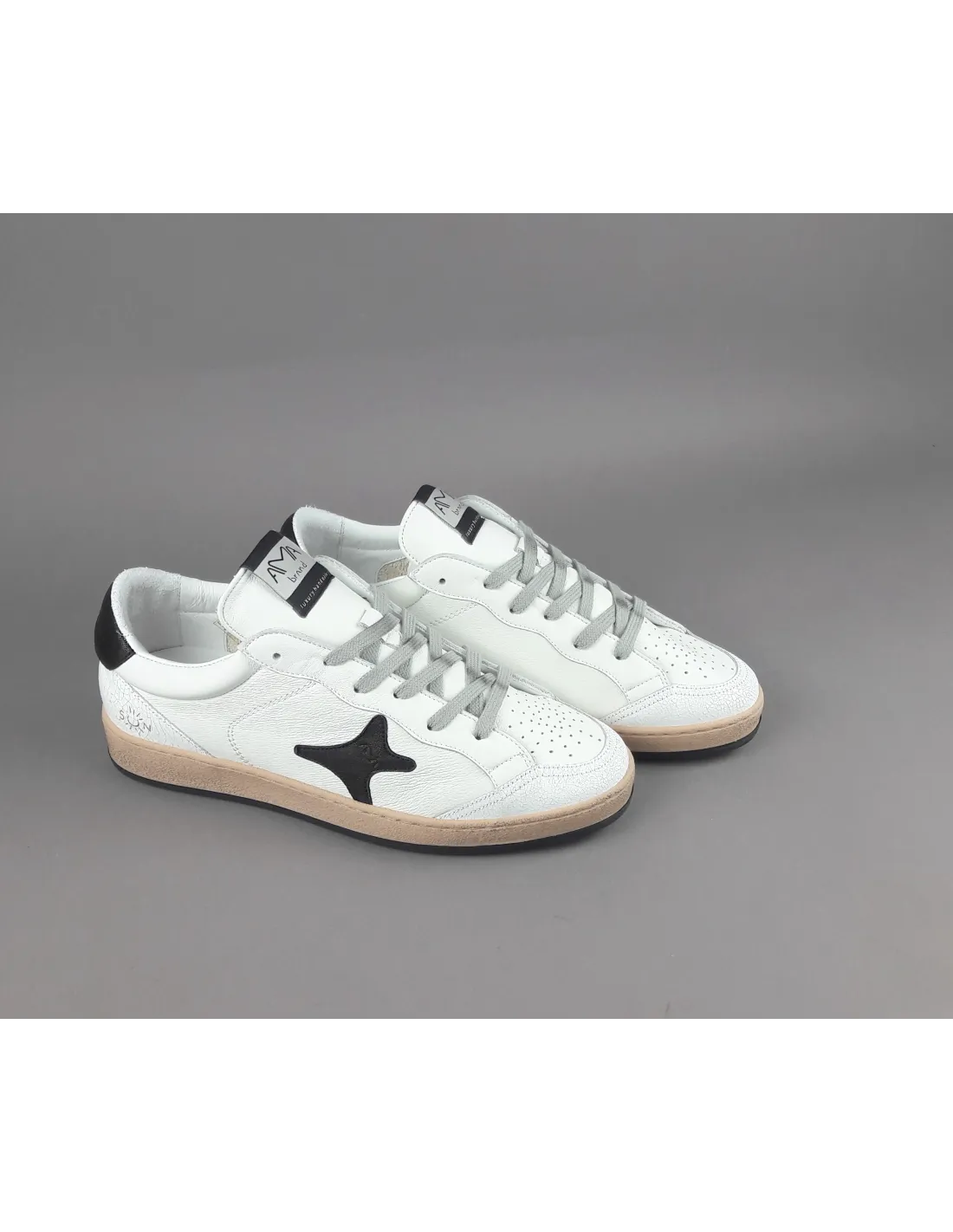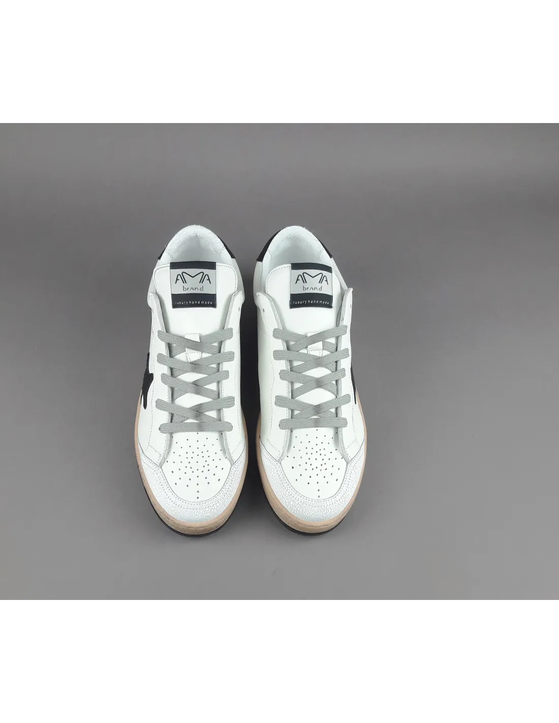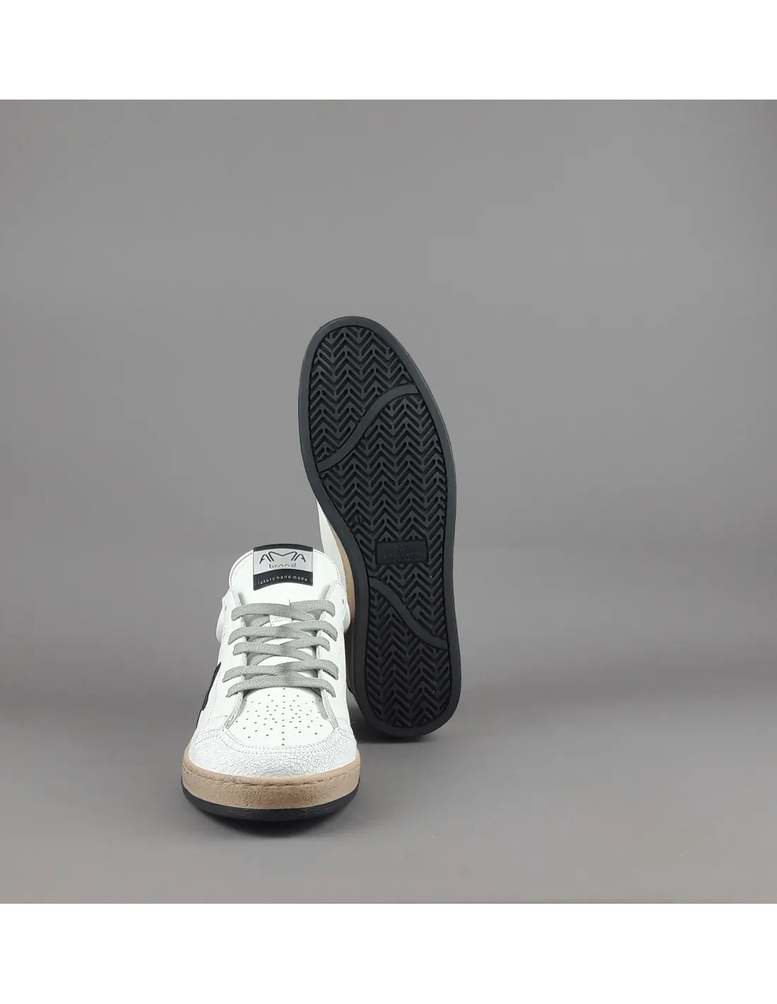 Ama Brand collezione estiva, sneakers uomo Sun, in pelle bianco con inserti in pelle craquelè, logo laterale in pelle nero, spoiler tallone pelle nero, dettagli tallone in pelle craquelè, fussbett estraibile, fondo gomma.