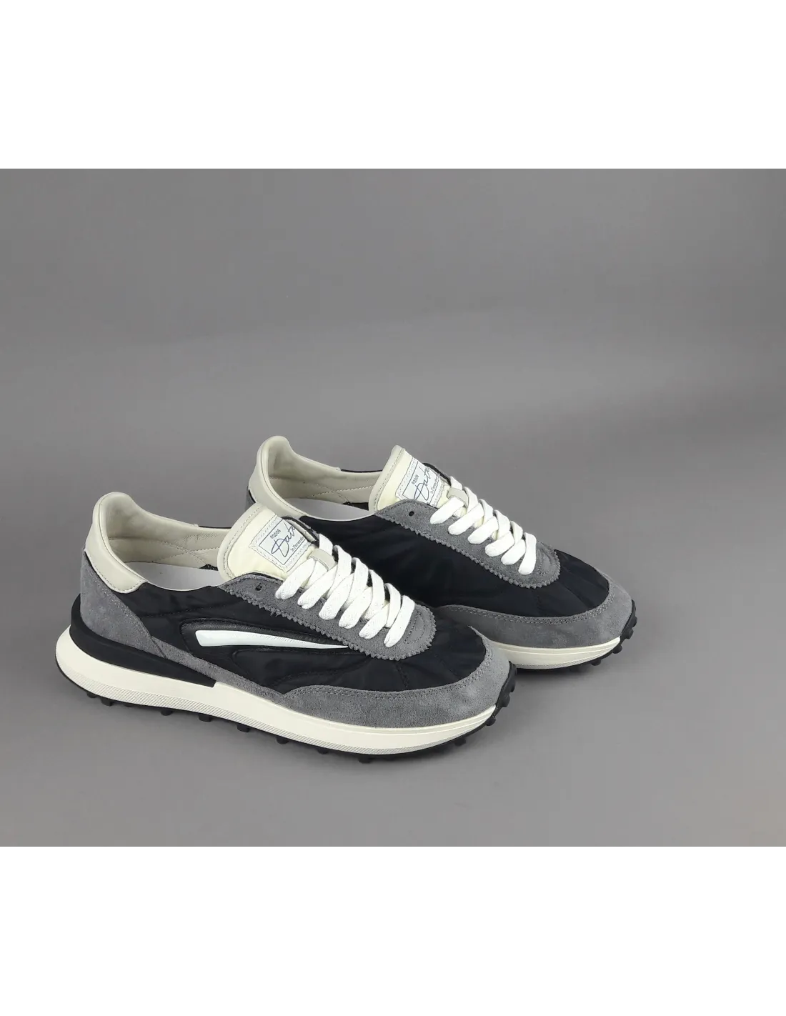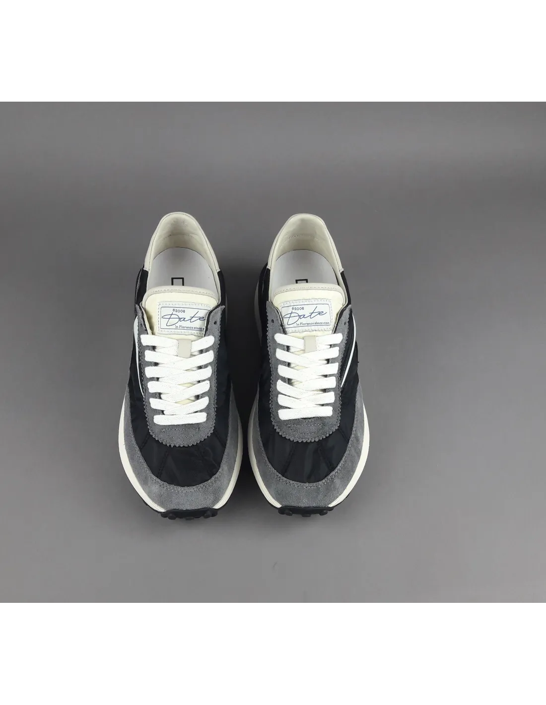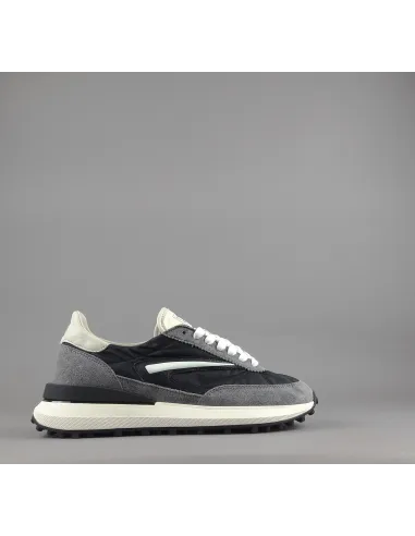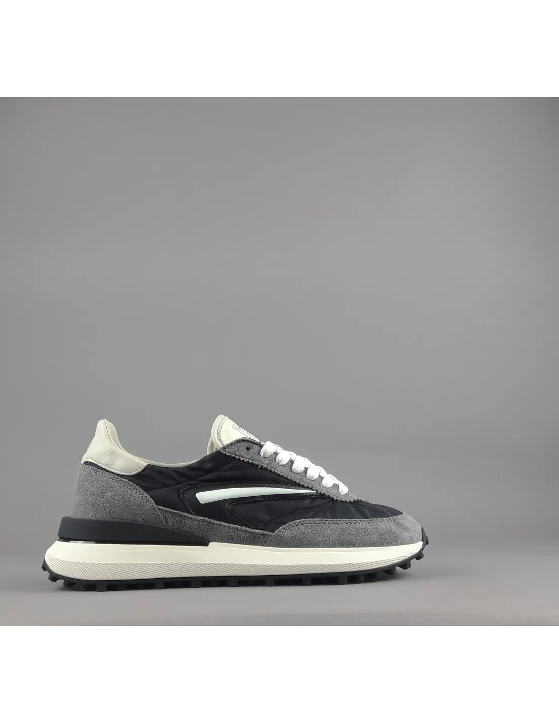 D.A.T.E collezione estiva, Sneakers uomo ATHLETA in camoscio grigio e tessuto tecnico nero, spoiler e baffo laterale avorio, soletta interna removibile di 2 cm, suola in gomma.