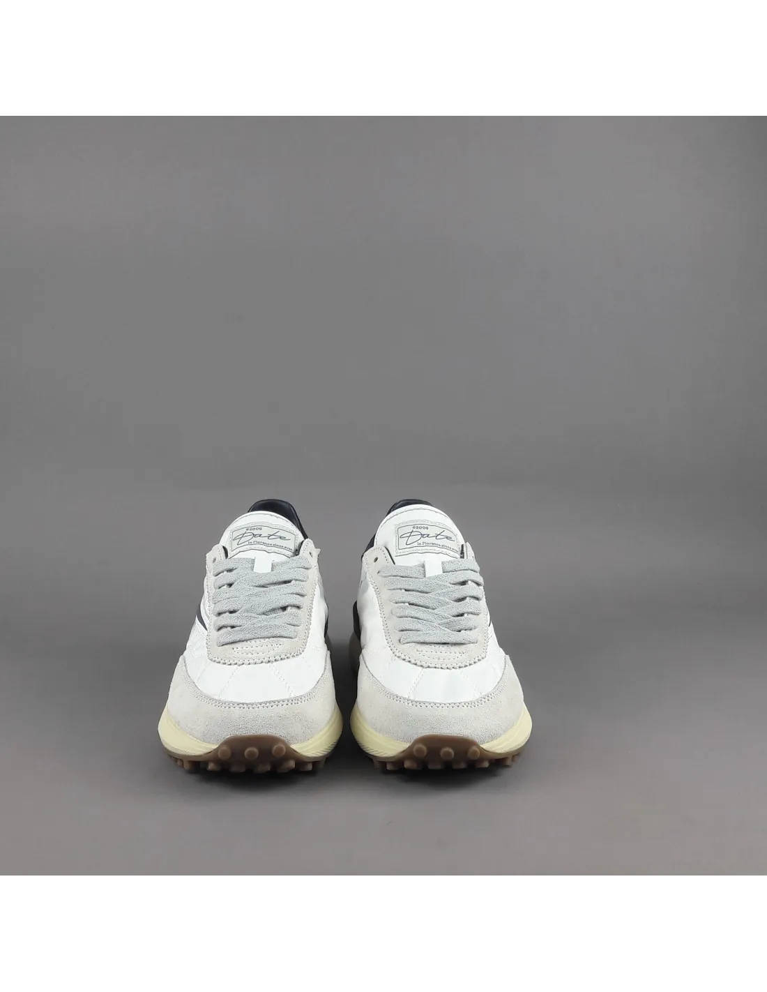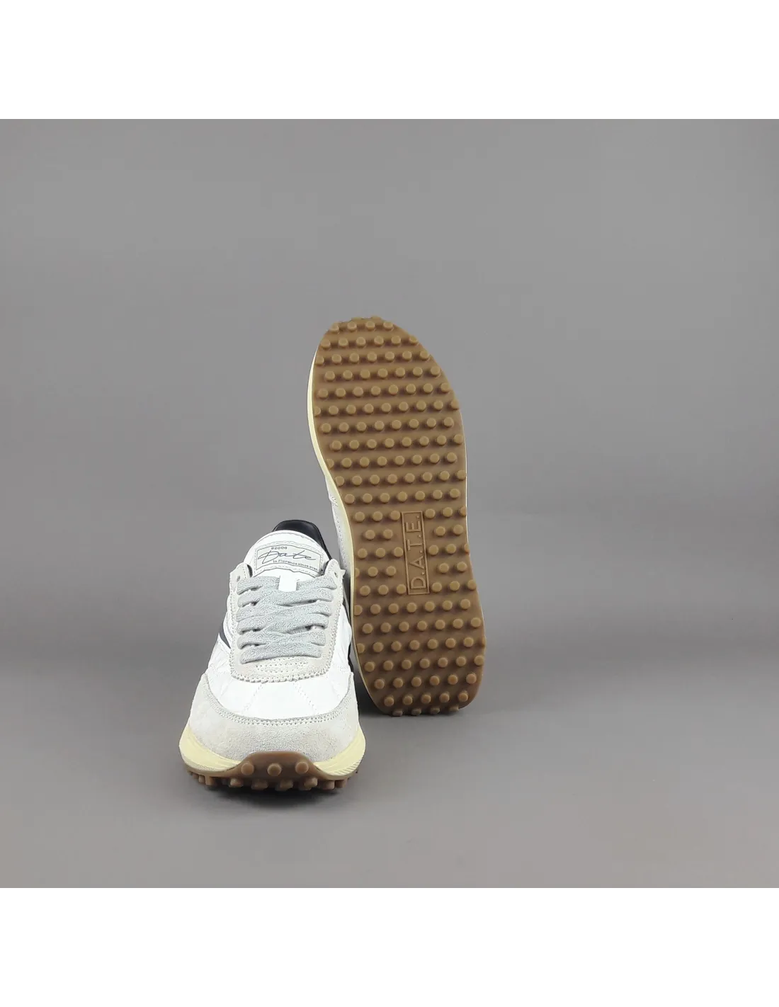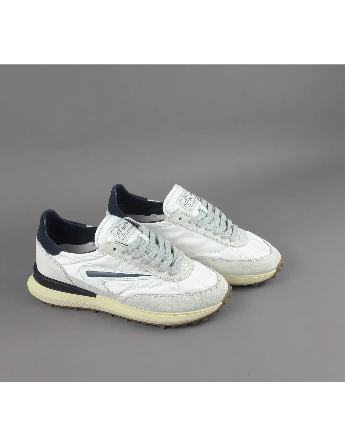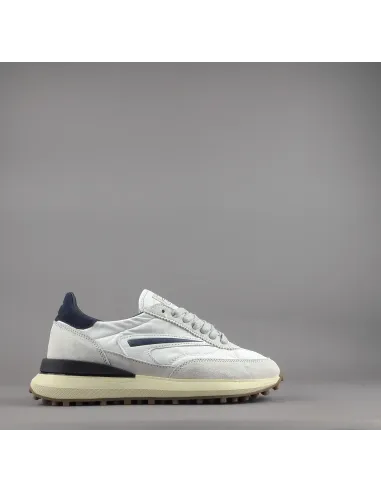 D.A.T.E collezione estiva, Sneakers uomo ATHLETA in camoscio ghiaccio e tessuto tecnico bianco, spoiler e baffo laterale blu scuro, soletta interna removibile di 2 cm, suola in gomma.
