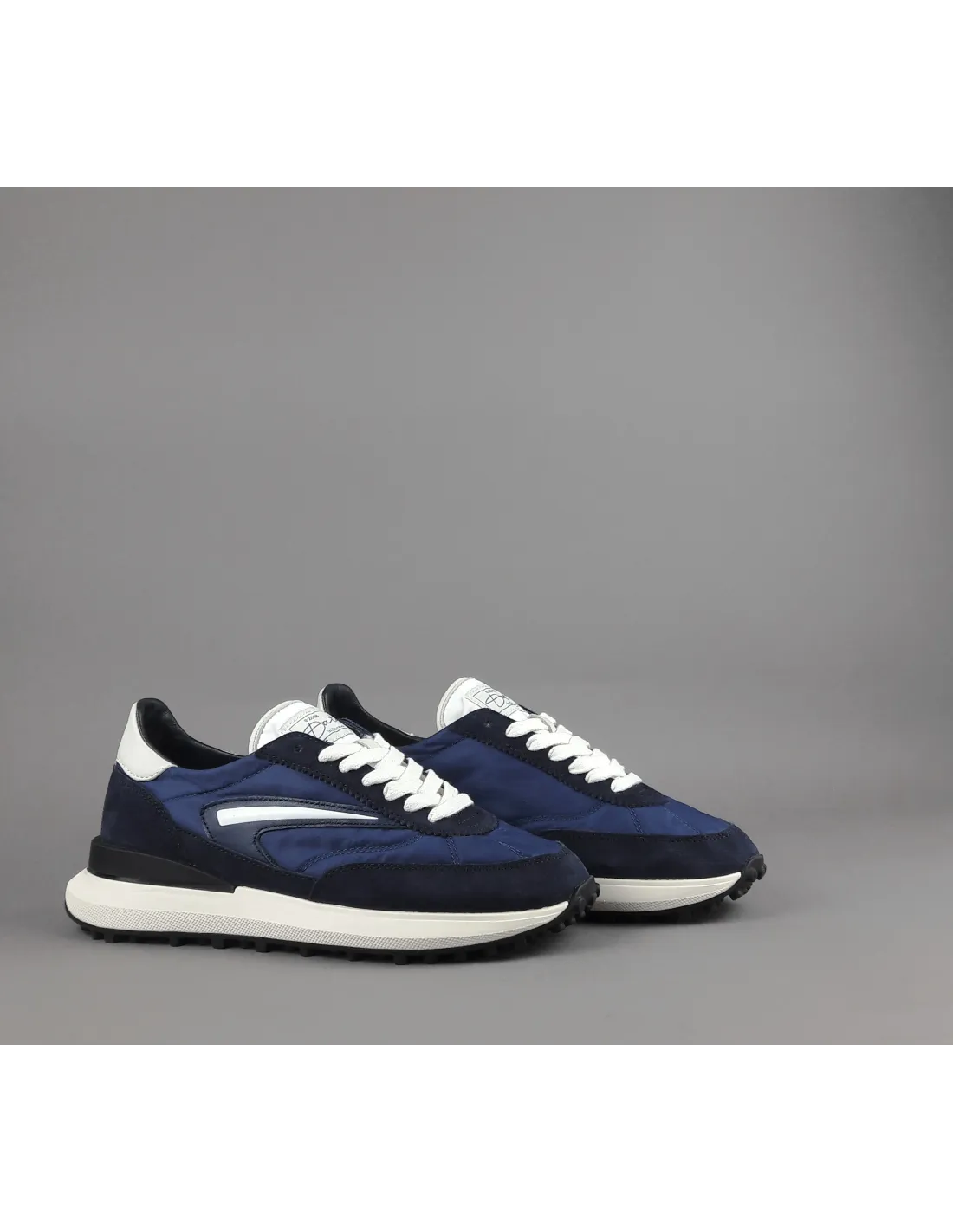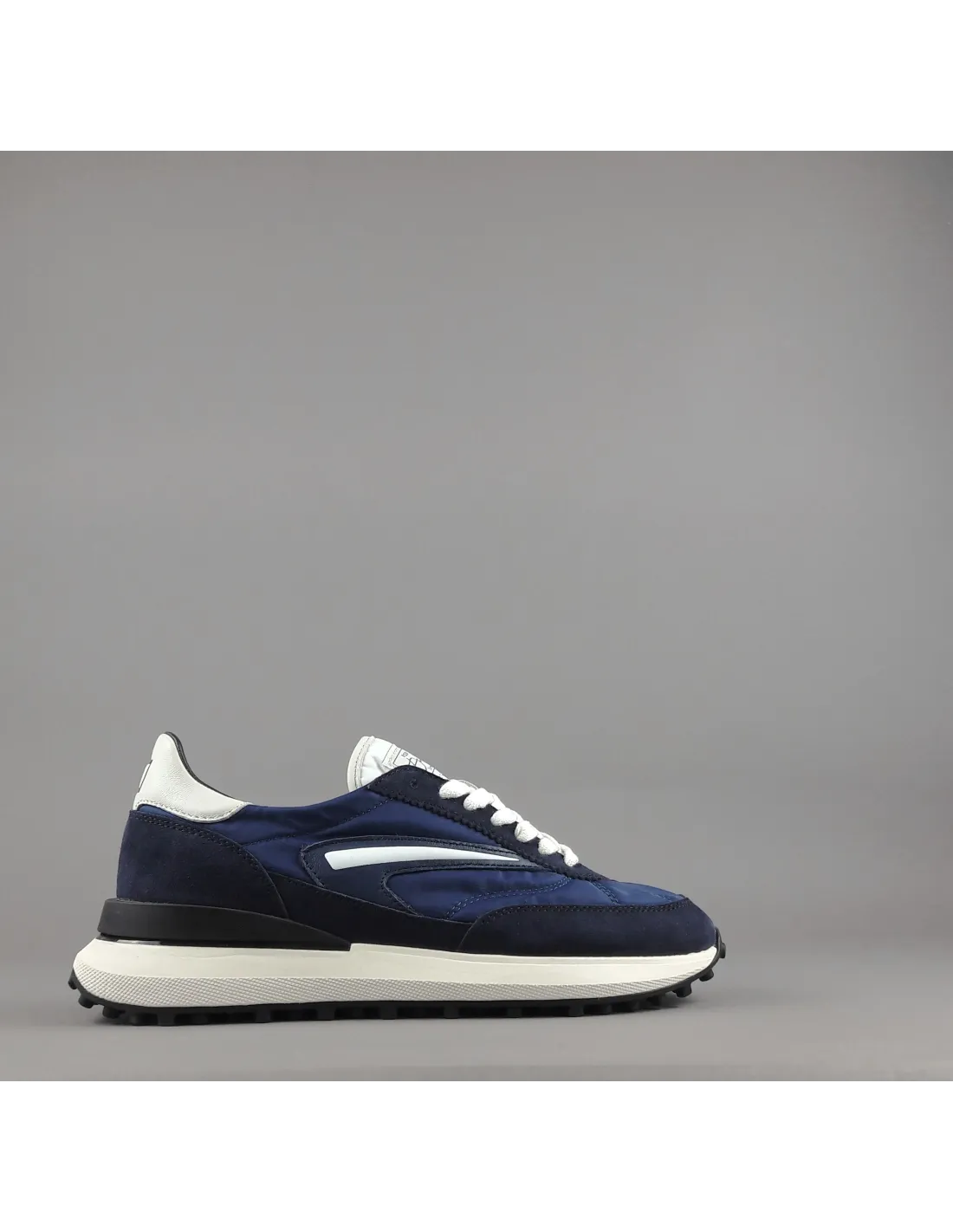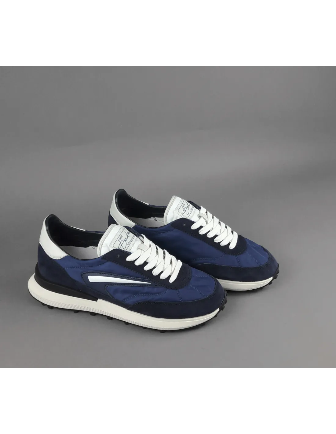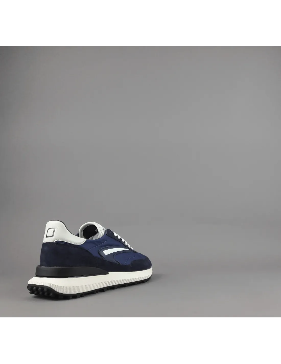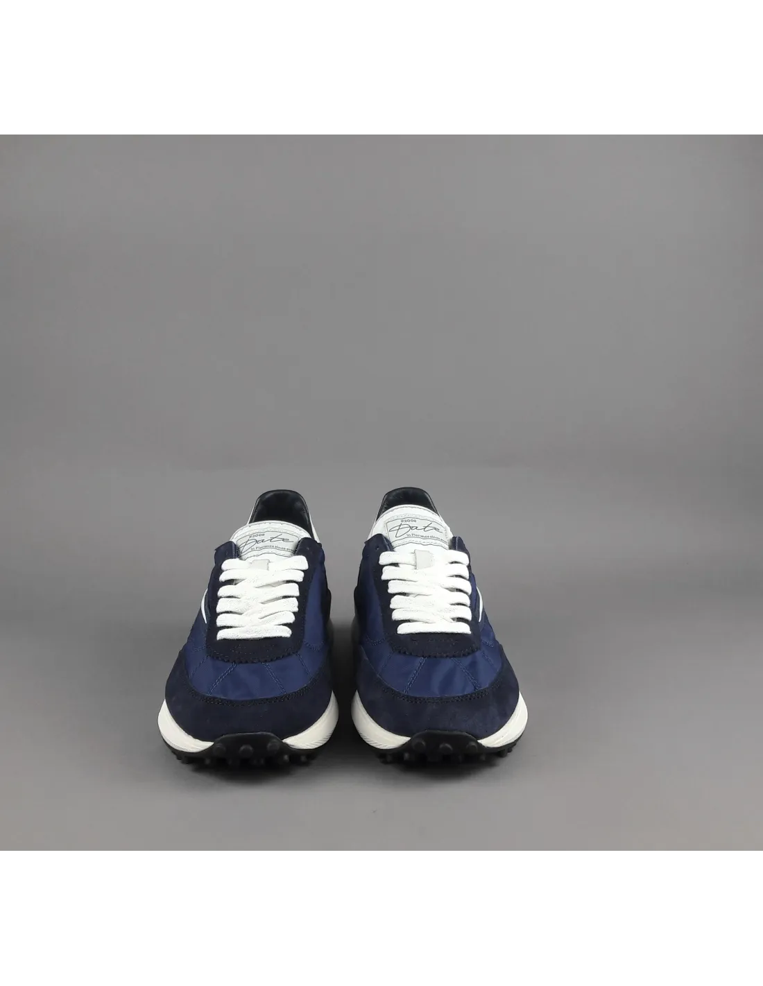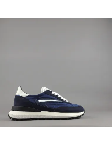D.A.T.E collezione estiva, Sneakers uomo ATHLETA in camoscio blu scuro e tessuto tecnico blu, spoiler e baffo laterale avorio, soletta interna removibile di 2 cm, suola in gomma.