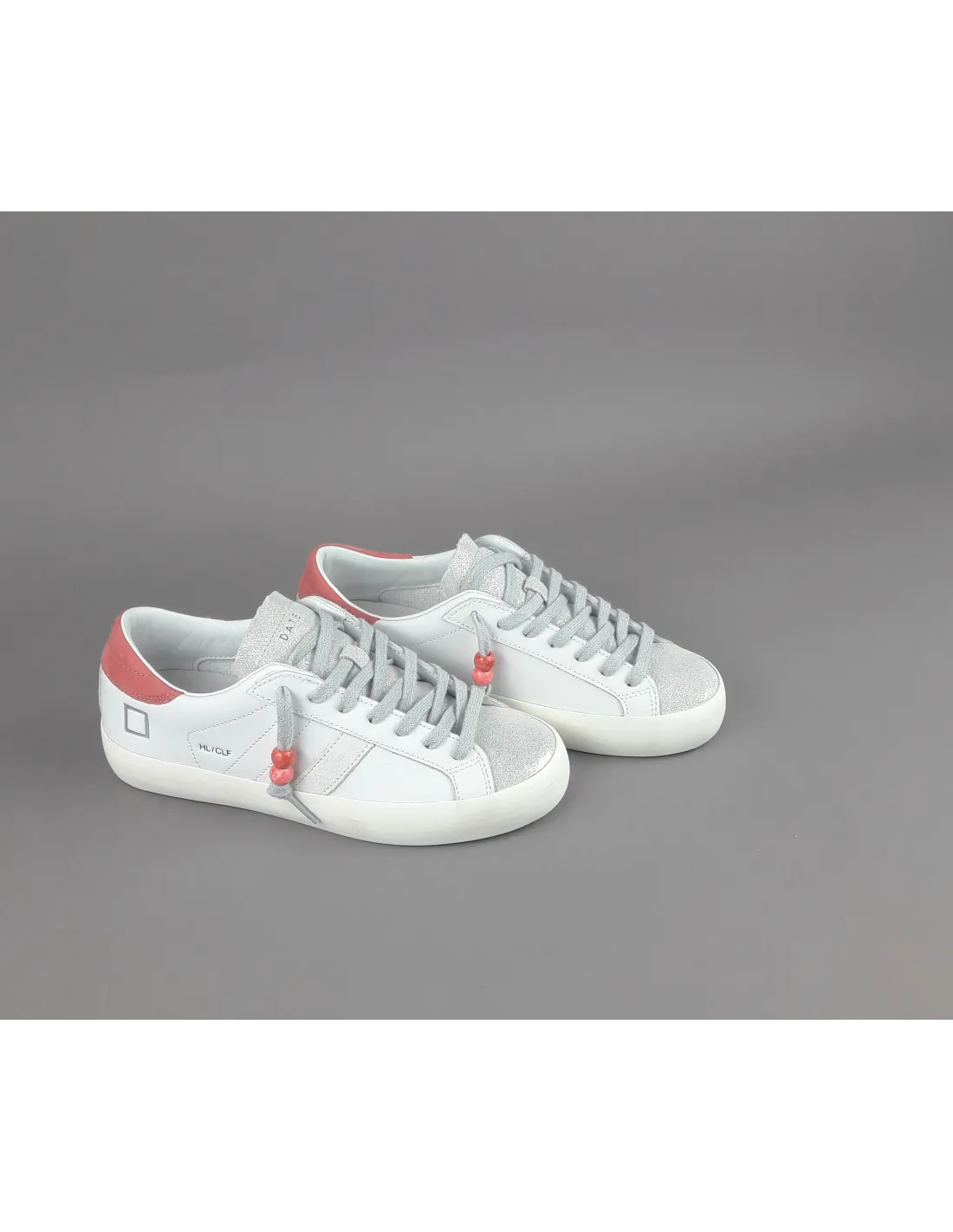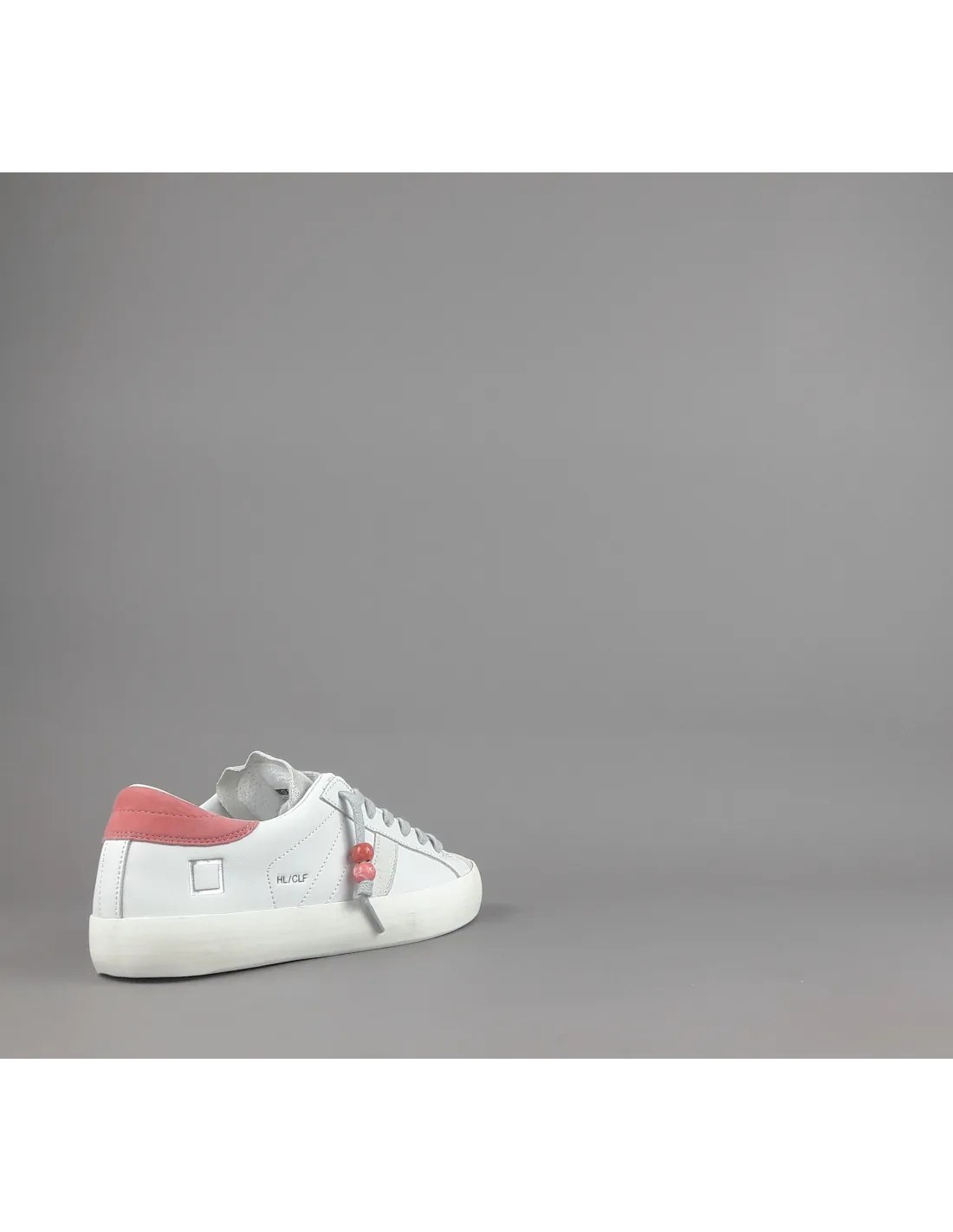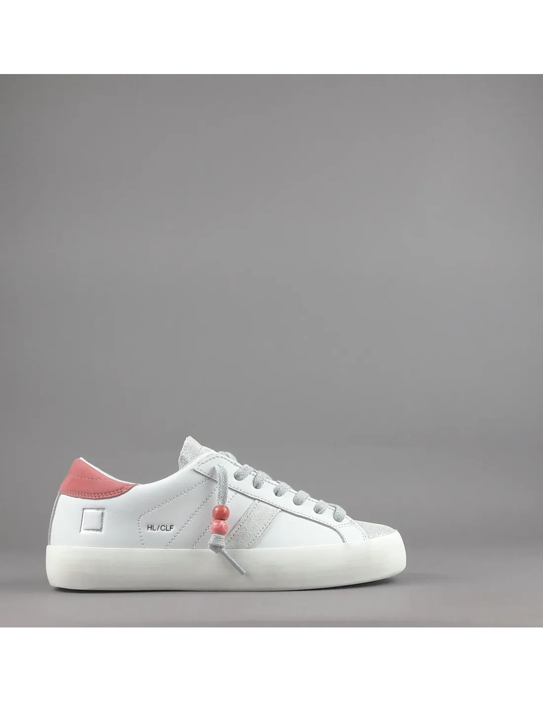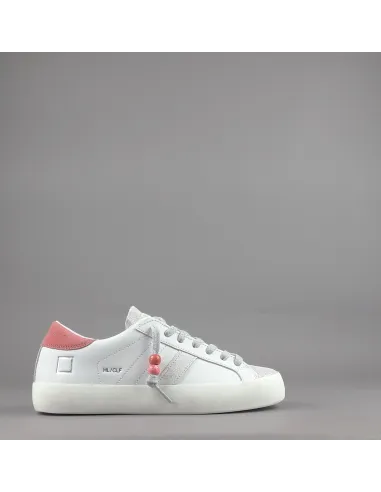 D.A.T.E. collezione estiva, Sneakers donna HILL LOW in pelle, spoiler in camoscio corallo, dettagli in punta in camoscio shiny, logo laterale impresso stampato, fondo fasciato, soletta interna removibile di 2,5 cm, suola in gomma.