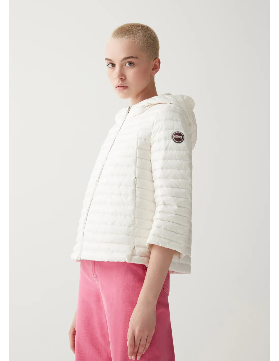 Colmar collezione estiva, Giacca modello cappa donna, in tessuto riciclato nylon, maniche a 3/4, imbottitura leggera in piuma naturale, chiusura con zip doppio cursore, cappuccio fisso