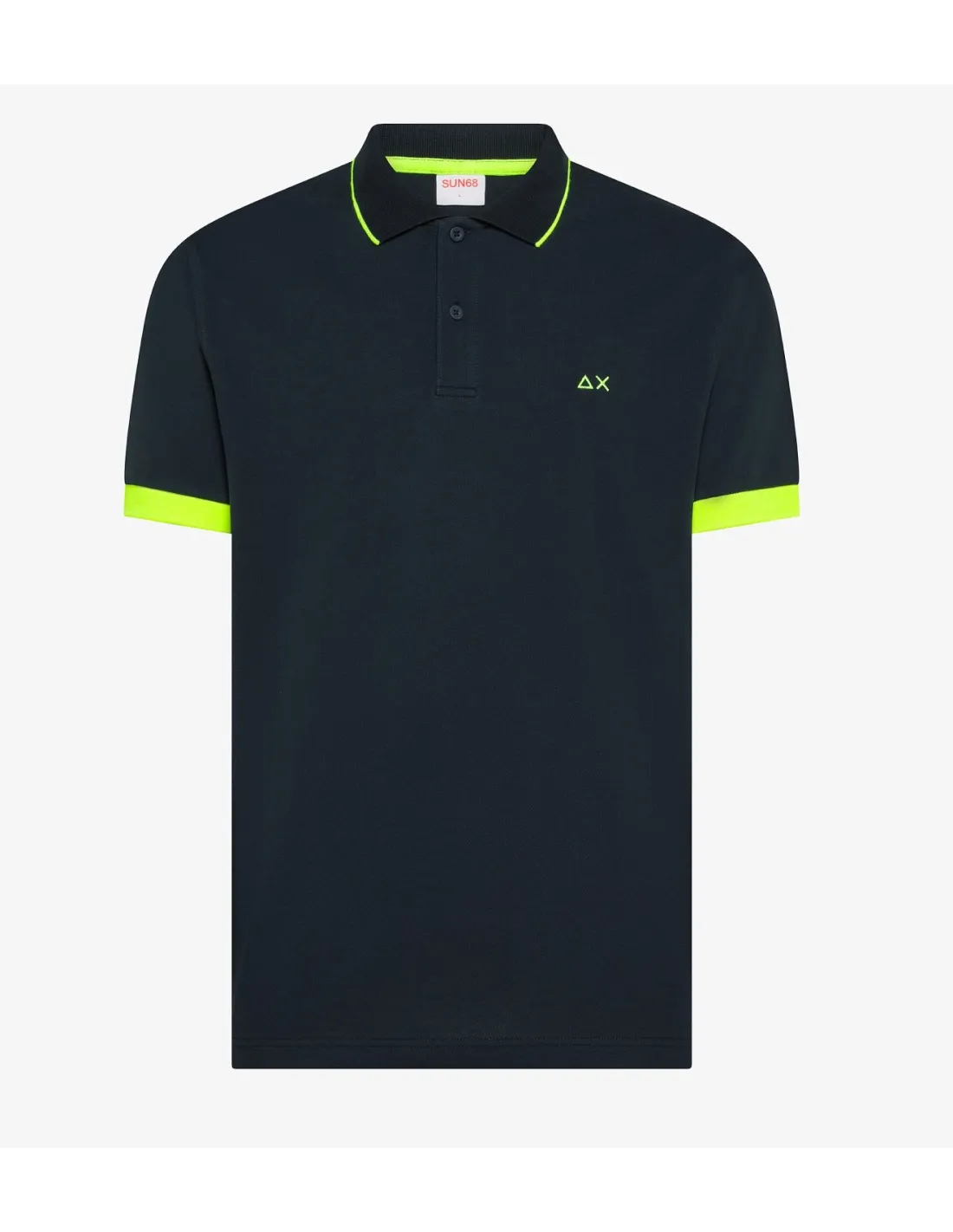 Sun 68 collezione estiva, polo uomo, in cotone stretch, manica corta, due bottoni, collo e maniche con bordo fluo, logo cucito, vestibilità regular